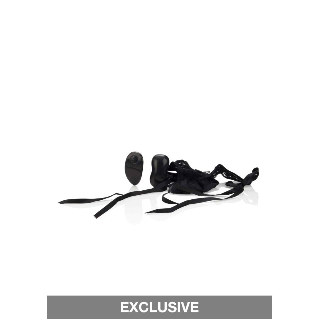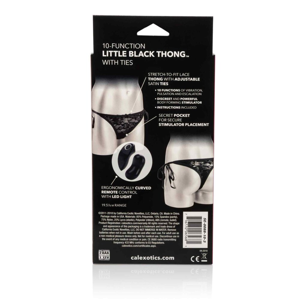 This is the perfect accessory to go under your little black dress – introducing the Remote Control 10-Function Little Black Panty™ Thong, a stretch-to-fit sexy lace G-string with a secret pocket for your massaging bullet. This super sexy and super thong comes complete with a miniature bullet and separate remote control with wireless connection – and there are 10 amazing pleasure settings of vibration, pulsation, and escalation to choose from! So you can have secret, intimate fun even when you’re out and about and each of the pleasure functions will give you an intense and sensual massage. Take control of the remote and give yourself discreet moments of intimate pleasure or enjoy some playful foreplay by handing over the remote control pad to your partner. This naughty toy makes for some seriously mischievous fun yet it’s designed to be tastefully discreet so you’ll have total privacy wherever you are. Measuring 2.75 inches long and curved to the contours of your body, the bullet can be removed for independent use and the stretchy thong with adjustable satin ties can be thrown into the washing machine like any other garment. The remote control and bullet have an impressive 6-meter range, making this toy the perfect foreplay toy for couples.