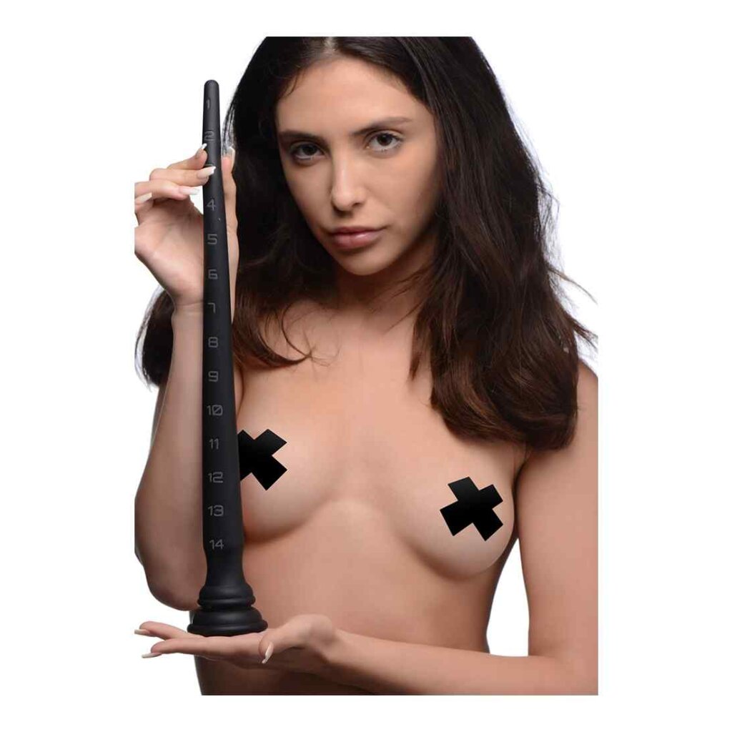 Test your limits and enjoy the up to 41.2 cm deep range of this Small Tapered Silicone Hose! The gradual taper is gentle on the entrance of your hole while still providing the satisfying fill you need! The strong suction cup holds the tube to any smooth and flat surface - perfect for the bathroom, but can also be used in any other room with a mirror or flat floors. Every inch is engraved on the surface of this velvety shaft, so you or your lover can set goals for each session so you can visibly push your limits. Made from high quality body safe silicone - phthalate free, super soft and deliciously flexible for a high quality, worry free session. Compatible with water-based lubricants only! Simply wash with warm water and a mild antibacterial soap before and after each session.
