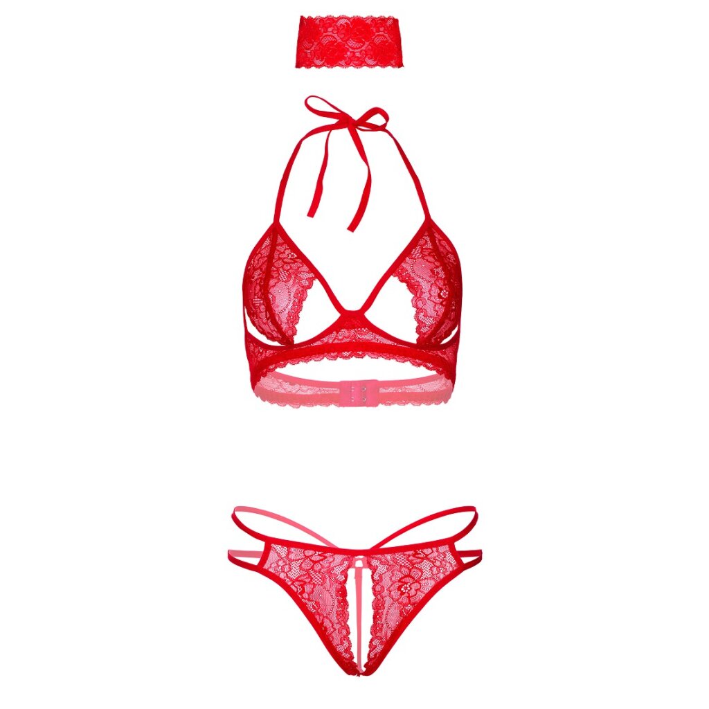 Soutien-gorge, culotte et bandeau 3 pièces - Ensemble ludique et coquin comprenant un soutien-gorge dos nu, un string ouvert à l'entrejambe et un bandeau assorti.