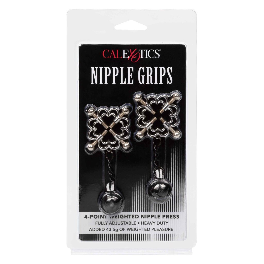 The Nipple Grips 4-Point Weighted Nipple Press is designed for sensational nipple play. Tighten the screws just as tight as you like and let the weights pull and tug for even more intense pleasure. Includes 2 fully adjustable multi-purpose clamps / Screw-on 4-point press with fully adjustable screws / Additional weight to increase stimulation / Total length: 10.25 cm / Diameter: 1.25 cm / Product weight: 43.5 g / Waterproof / Material: Nickel-free zinc alloy (screws) - Nickel-free iron (chain, weight)