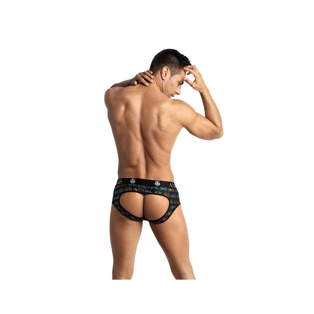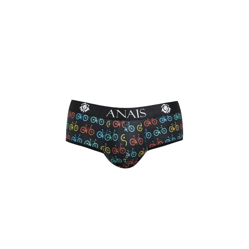 In einem eleganten Schwarzton gehalten, ist der Jockslip mit einem lebendigen Muster von bunten Fahrrädern verziert.