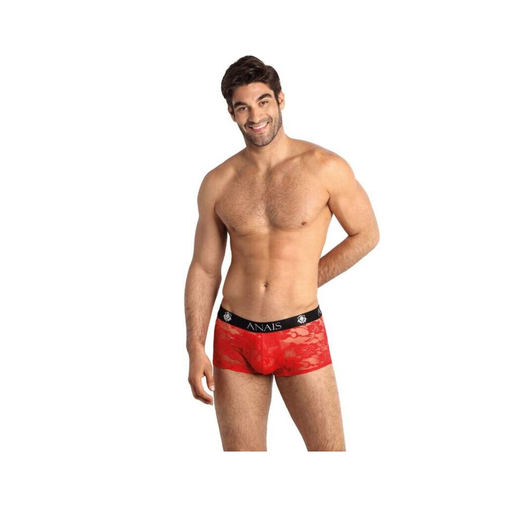 Erleben Sie die Sinnlichkeit und Eleganz der ANAIS Men Brave Boxershorts mit Spitzenmuster in leidenschaftlichem Rot.