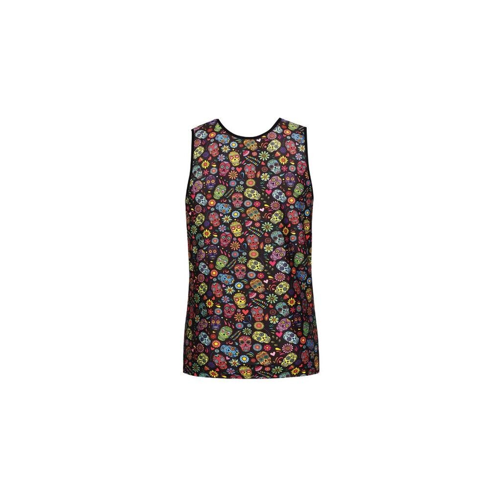 Das Top ist mit bunten Blumen und Totenköpfen bedruckt und verleiht Ihrem Look einen verspielten und ausgefallenen Touch.