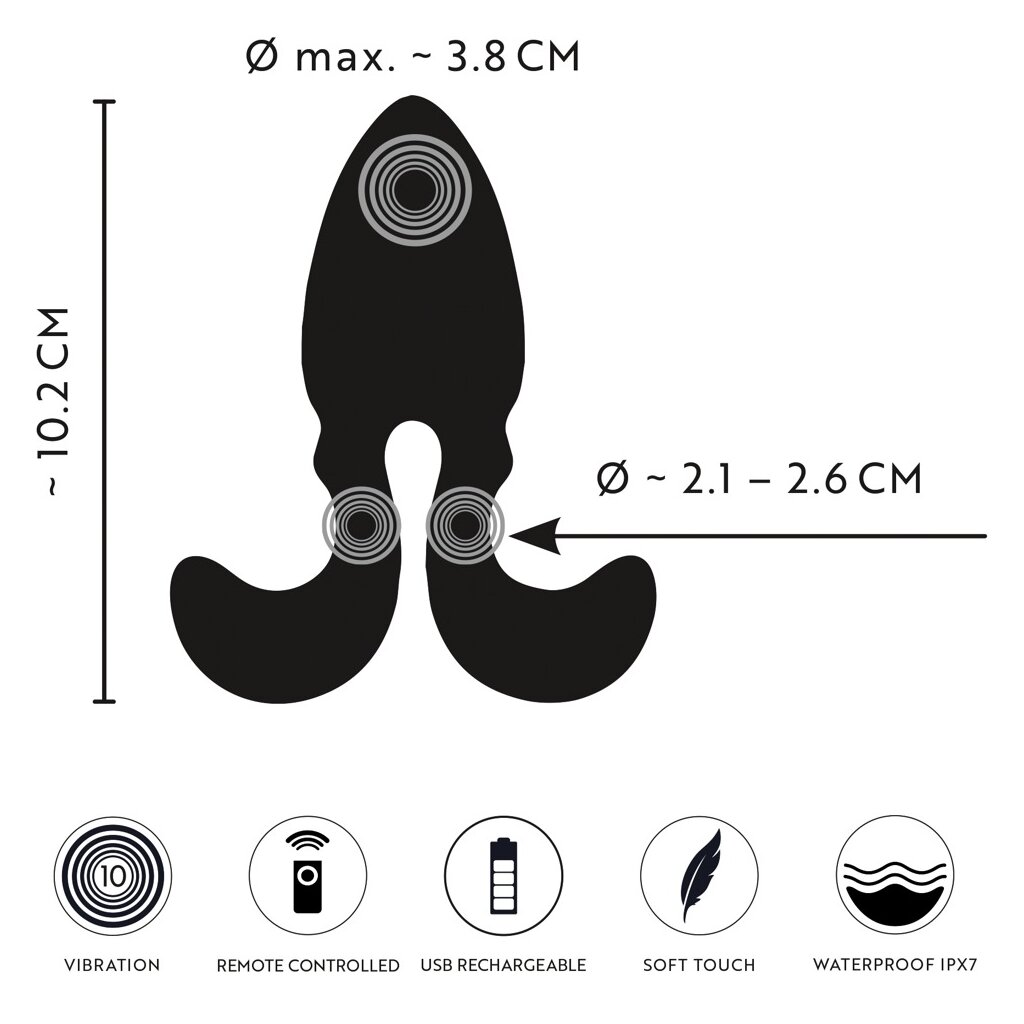 A powerful, quiet motor provides 10 versatile vibration modes. The small, practical remote control allows you to conveniently control the combined vibrations in the tip and taper. With a range of 8 meters, your partner can also control it. Even in the bath or shower, because the vibrating butt plug is waterproof. The vibrations can also be controlled directly on the toy at the touch of a button.