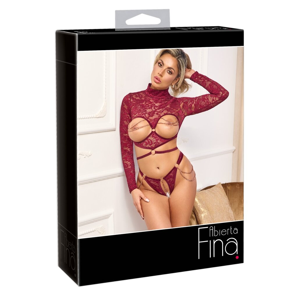 Exciting set from Abierta Fina with a bust-free long-sleeved top and a crotchless thong. Fine dark red lace seductively set off with velvet ribbons and rose gold-colored chains & rings. Soft and stretchy in all areas for a high level of comfort. Supple top with a small stand-up collar and velvet waistband. The decorative chains over the bare chest can be removed completely. As can the double chains on the thighs and the stimulating chain in the open crotch.