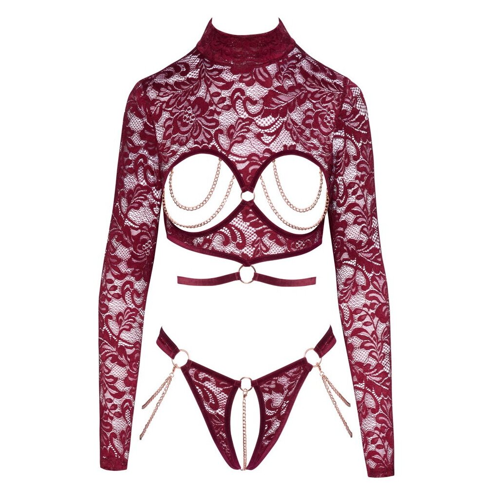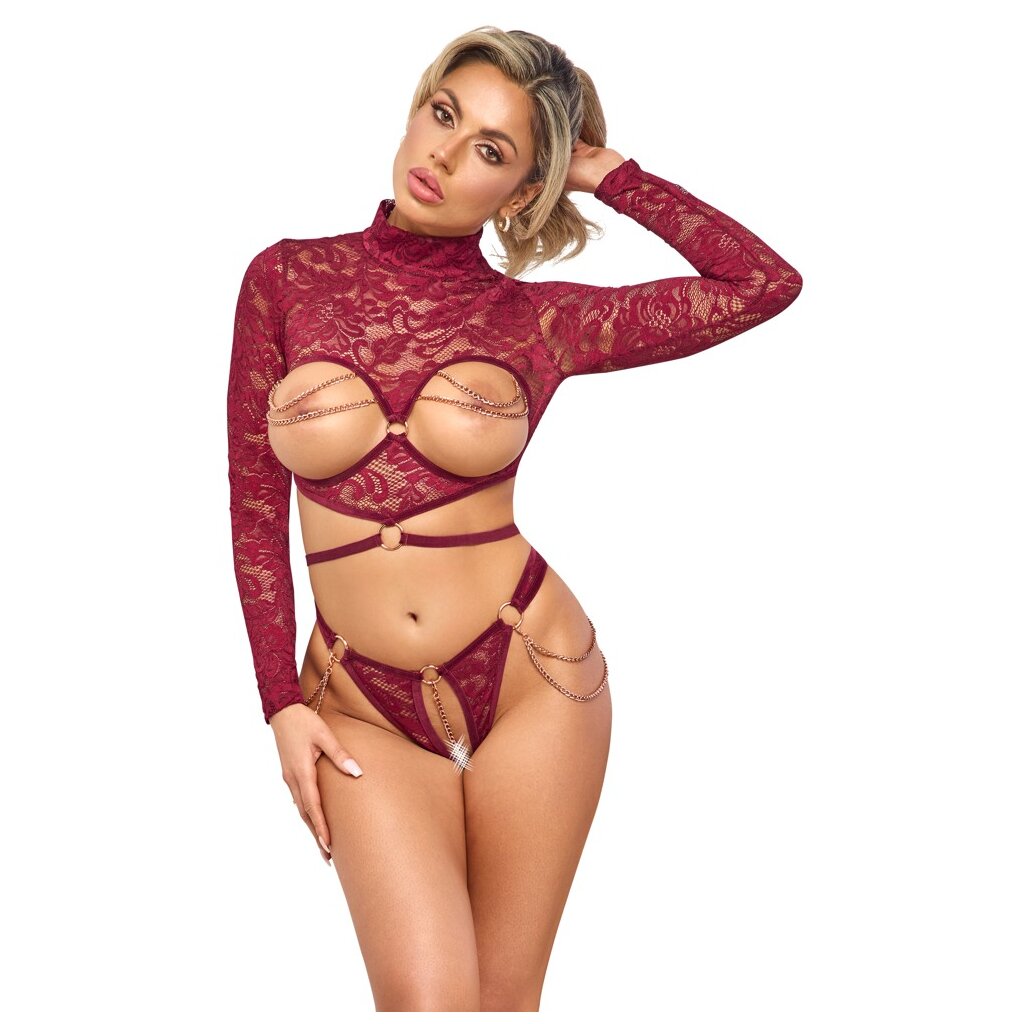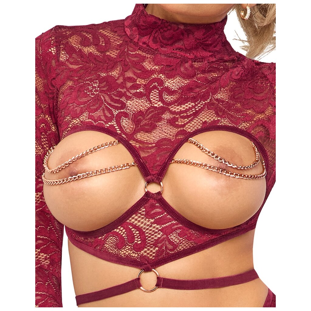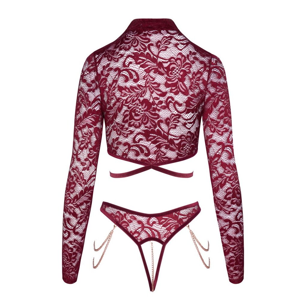 Ensemble excitant d'Abierta Fina composé d'un haut à manches longues sans buste et d'un string sans entrejambe. La fine dentelle rouge foncé est séduisamment mise en valeur par des rubans de velours et des chaînes et anneaux de couleur or rose. Douceur et élasticité dans toutes les zones pour un grand confort. Haut souple avec petit col montant et ceinture en velours. Les chaînes décoratives sur la poitrine nue peuvent être entièrement retirées. Il en va de même pour les doubles chaînes sur les cuisses et la chaîne stimulante dans l'entrejambe ouvert.