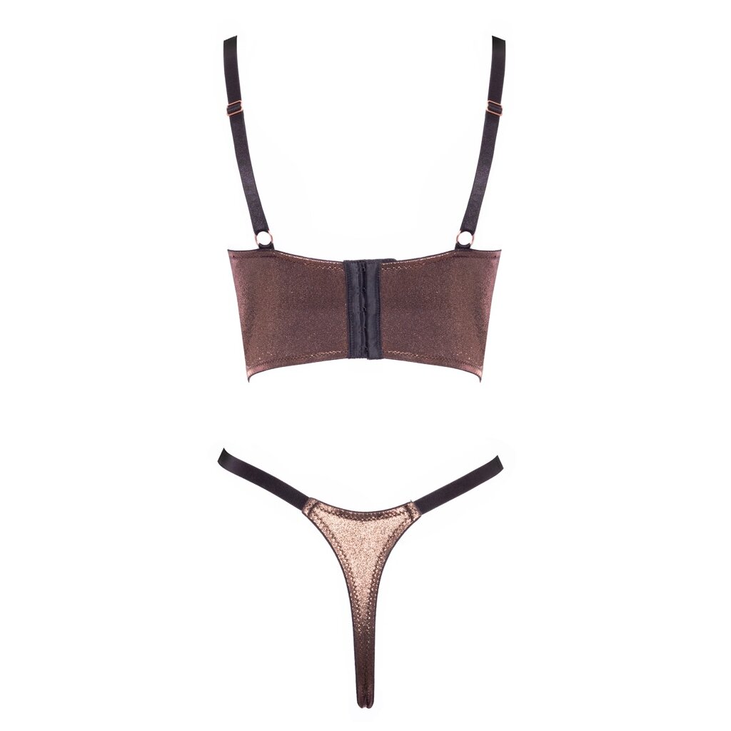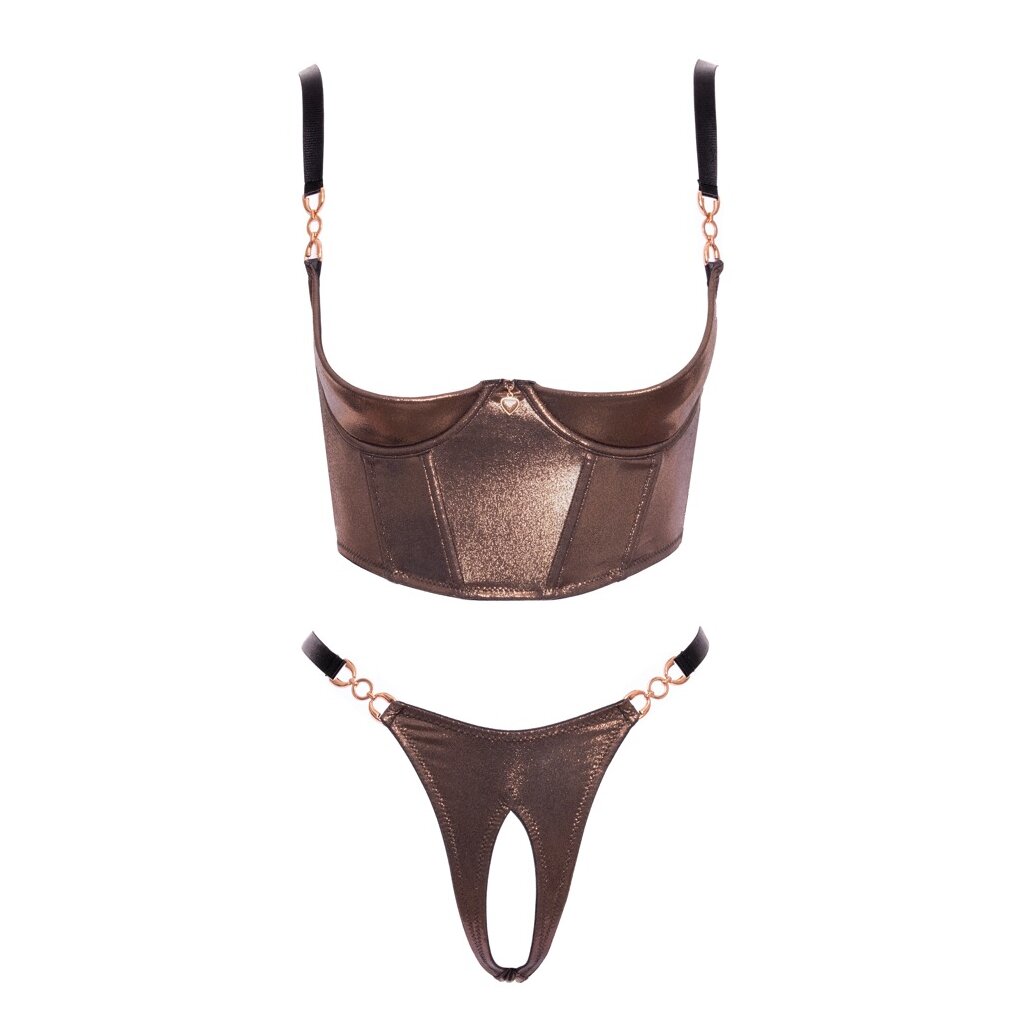 Luxurious ouvert set from Abierta Fina with push-up bra and Rio thong in stylish, shimmering bronze gold with black details and elegant rose gold-colored jewelry elements. Elastic, soft, and supple all around. Longer cut push-up bra with molded underwires at the front and lightly padded underwire cups for a perfect fit without underwires. Small heart-shaped decorative pendant between the cups. Beautiful decorative detail on each of the adjustable straps at the front. Adjustable hook closure at the back. The Rio thong seduces with an open crotch and decorative details at the front of the elastic waistband.
