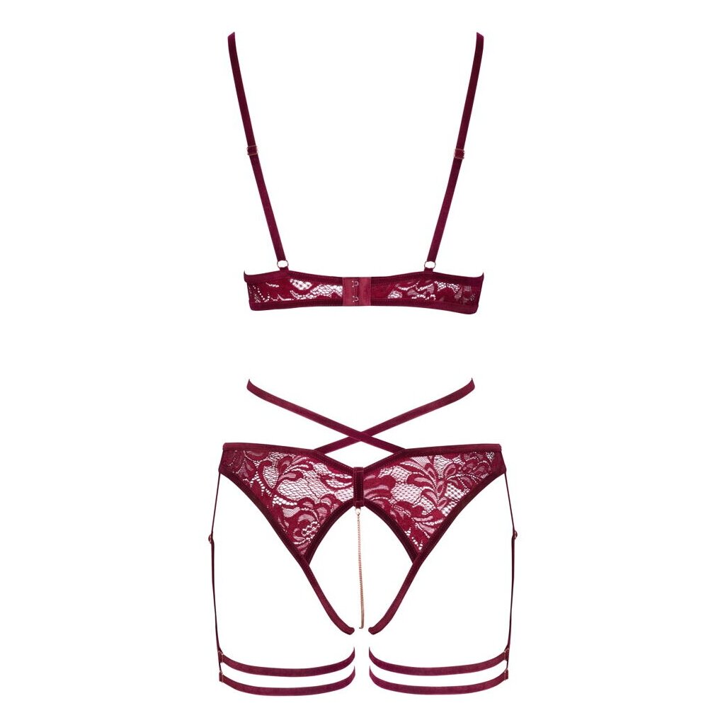 Ensemble excitant d'Abierta Fina composé d'un soutien-gorge à armatures et d'une culotte sans entrejambe. La fine dentelle rouge foncé est mise en valeur par des rubans de velours et des accessoires dorés à l'or fin. Souple et extensible sur toute la surface pour un grand confort. Des chaînes de bijoux encadrent les seins nus, 3 chaînes amovibles dans l'entrejambe complètement ouvert stimulent chaque mouvement. Les bretelles du soutien-gorge et le crochet au dos sont réglables. Slip à bretelles avec ceinture en velours au niveau des hanches. Les bretelles en velours et les doubles courroies de cuisse sont réglables.
