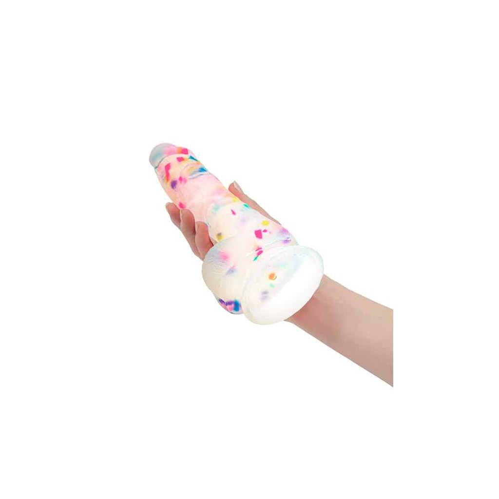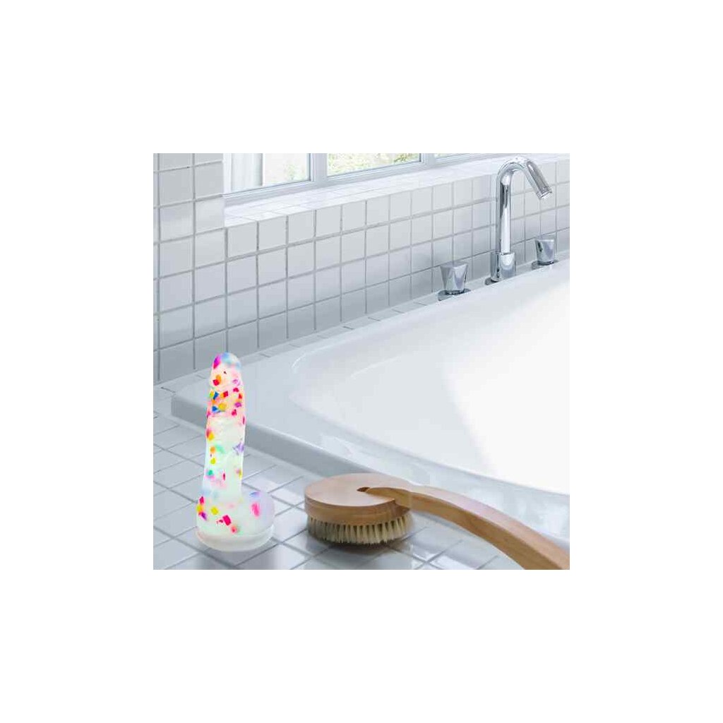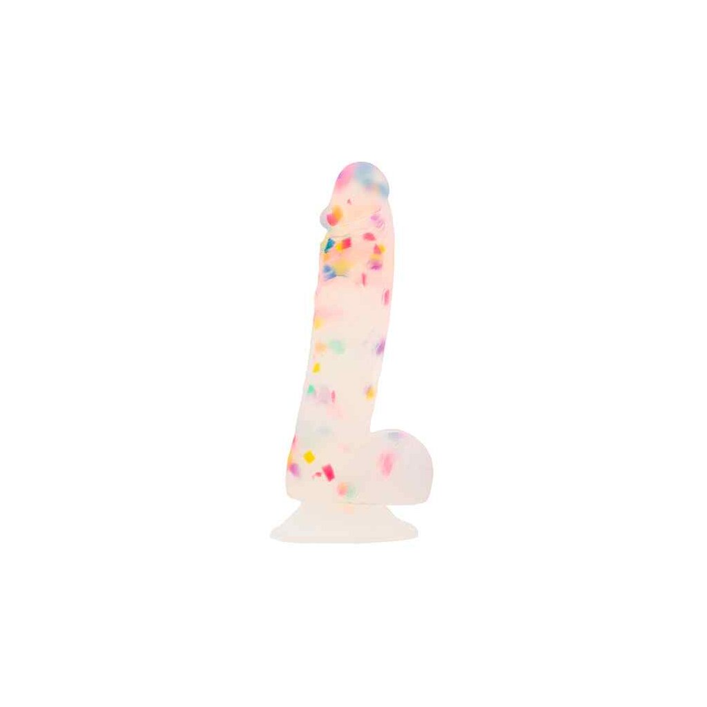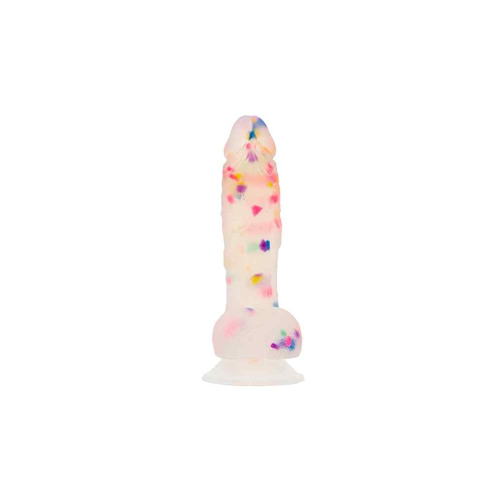 Get the party started with this frosted silicone dong with a fun rainbow confetti design, and realistic texture. This dong has a superior suction cup and is harness compatible so you can decide how you want to play.
