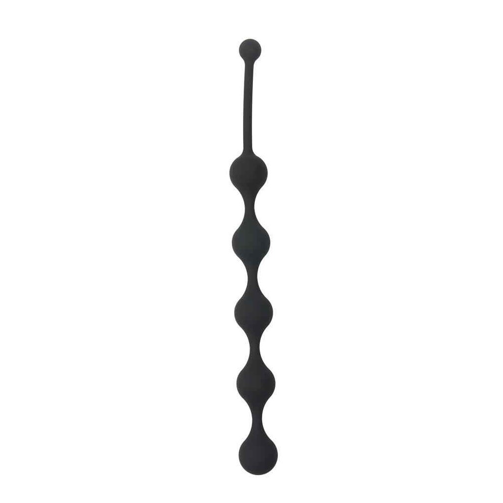 Une ficelle de 5 billes lestées pour la stimulation anale, en silicone hygiénique noir. Les cinq billes ont chacune un diamètre de 2,5 cm (0,9 pouce), et la longueur totale de la ficelle est de 28,1 cm (11,1 pouces). Un cordon anal en silicone est un excellent jouet pour les jeux anaux. En l'insérant dans l'anus, les billes procureront des sensations excitantes, et de même lorsque vous les retirerez lentement, une par une.