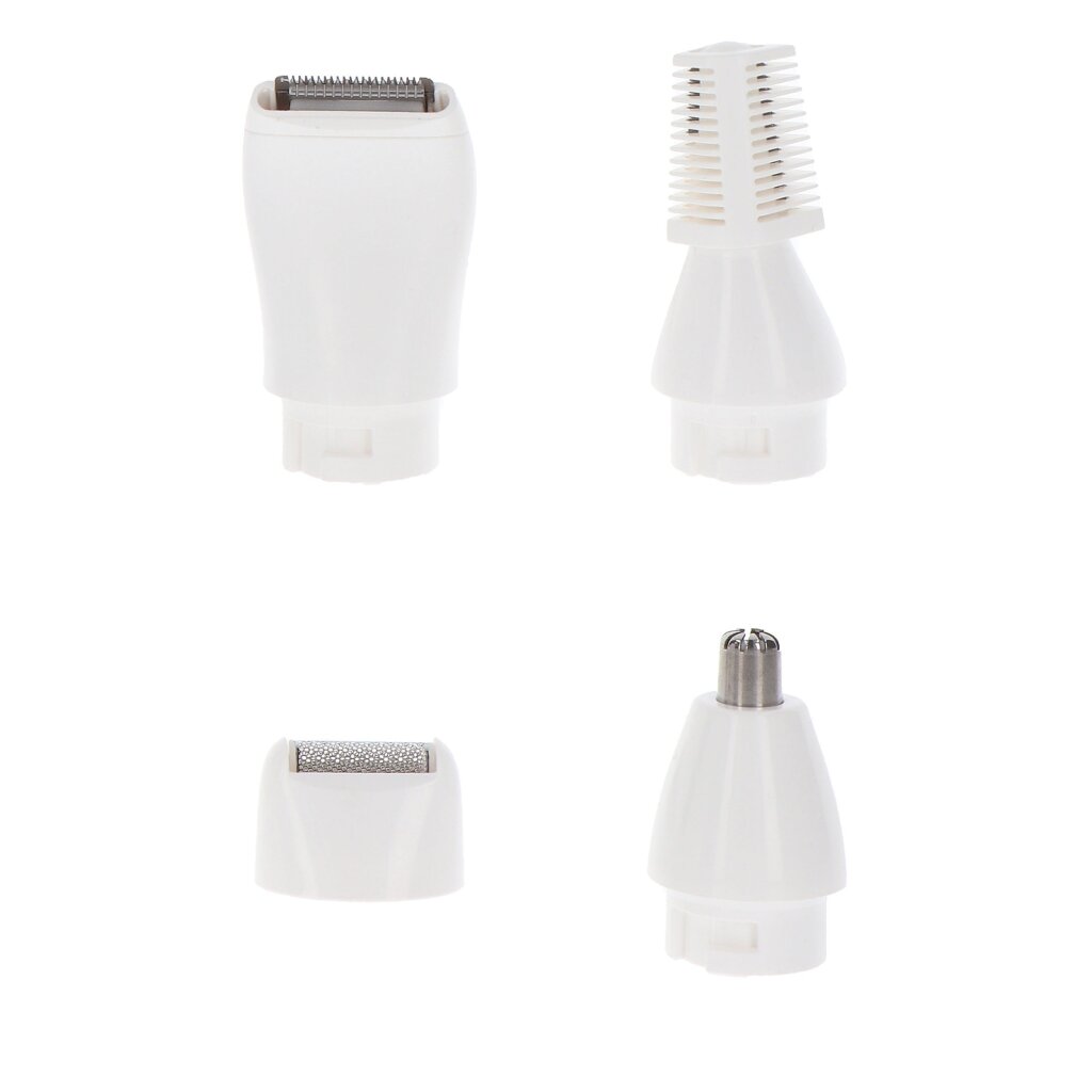 All-in-one ladies' shave - Trim and style your facial and body hair precisely with the all-in-one ladies' shave from Mae B. The ergonomically shaped handle provides optimal control and comfort during use. The sharp, hypoallergenic stainless steel blades remove facial and body hair efficiently and safely. The all-in-one women's shaver includes a complete set with four different shaving heads and a storage bag to keep the device and accessories safe. Total length: 18 cm / Water resistance: Splash-proof / Material: ABS plastic | Stainless steel / 1 AA battery required (not included)