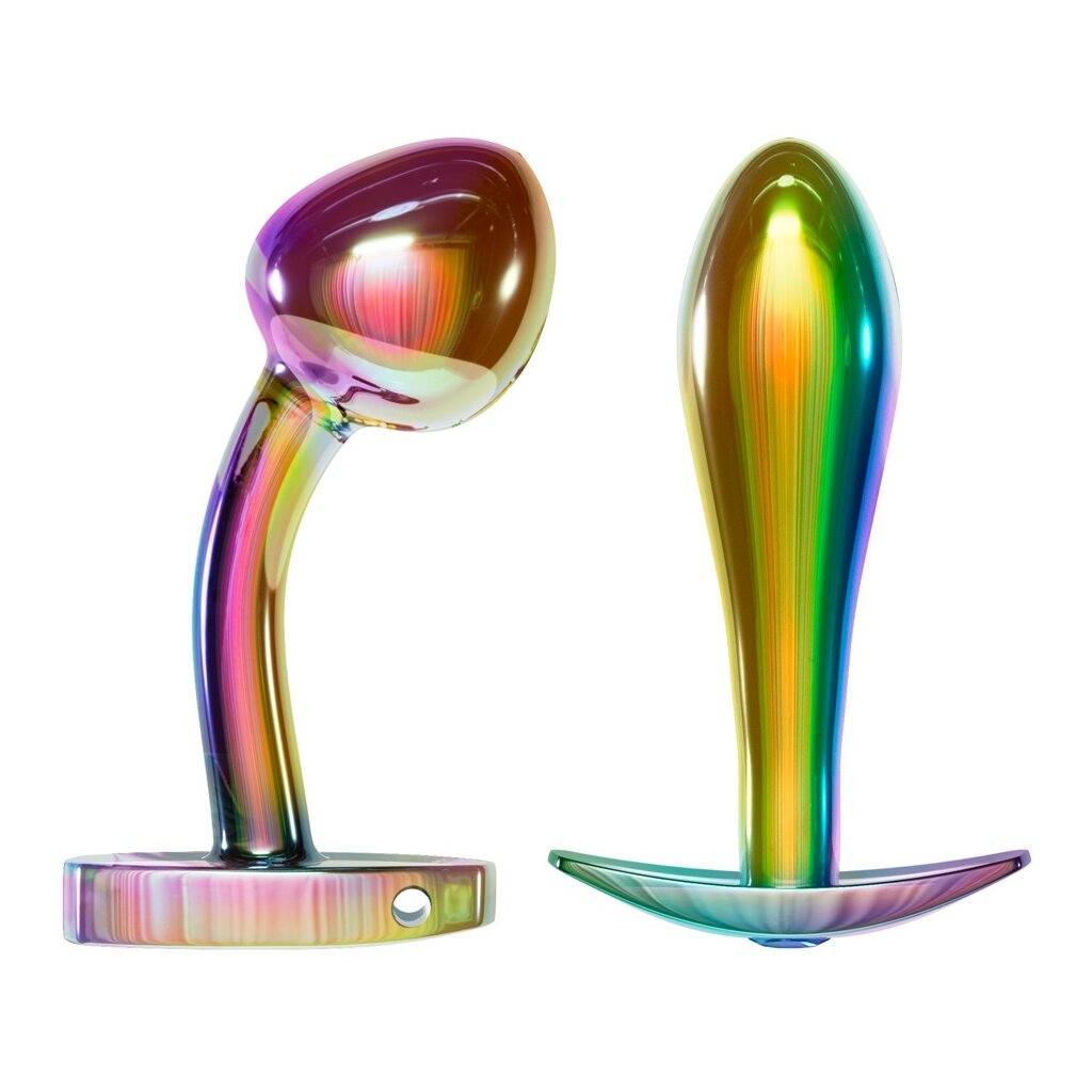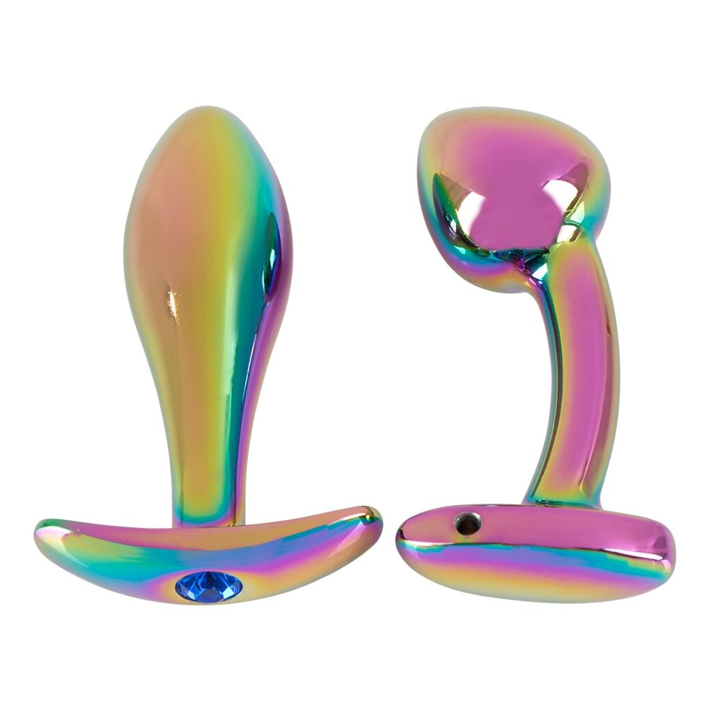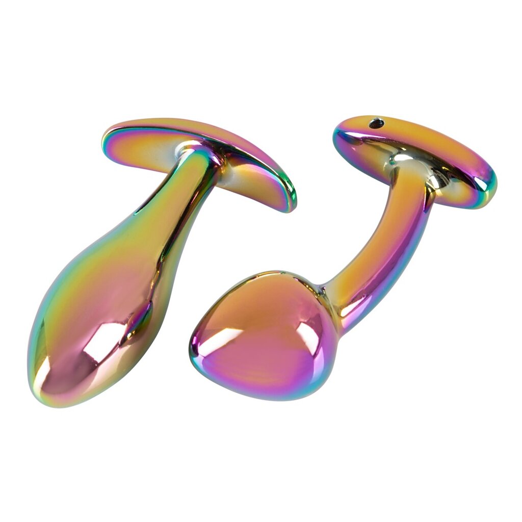 Metal Butt Plug Set in Rainbow Colors by ANOS with 2 metal anal plugs in precious iridescent rainbow colors. One is classically conically shaped, the other is slightly curved with a shaped P-spot tip.