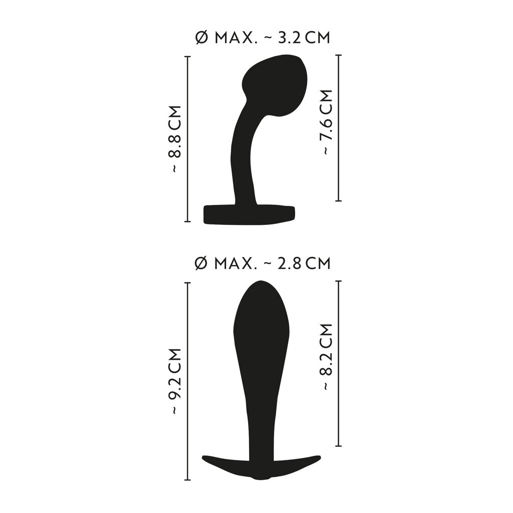 Curved plug: total length 8.8 cm, insertion length 7.6 cm, Ø max. 3.2 cm. Weight 75 g.