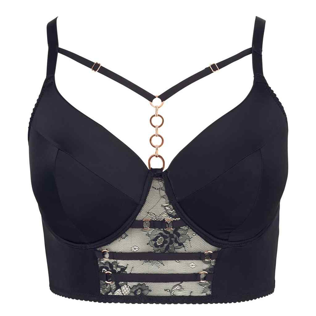 Für ein atemberaubendes Dekolleté! Longline-BH mit leicht gefütterten Bügel-Cups. Die raffinierten Cup-Bänder und die Träger sind für perfekte Passform verstellbar. Schwarz, mit edlen roségoldfarbenen Details. Blickdichtes, elastisches Material 95% Polyester, 5% Elasthan; transparenter Spitzen-Einsatz vorne 90% Polyamid, 10% Elasthan.