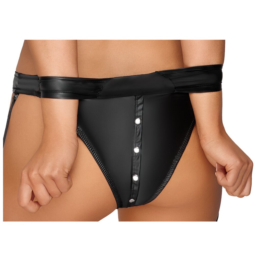 Bralette et culotte à bretelles dans un ensemble de Cottelli BONDAGE dans un noble look noir mat avec des détails argentés. Bralette au décolleté profond avec anneau et barre jusqu'à la bande de cou avec fermeture à bouton-pression réglable dans le cou. Les larges bretelles se divisent en 4 bretelles étroites dans le dos et sont toutes réglables. Culotte à bretelles à taille haute avec fermeture à pression à l'entrejambe jusqu'au-dessus des fesses. Pour des moments de plaisir captivants, une manchette douce est solidement cousue à l'arrière de la ceinture de la culotte. Les porte-jarretelles réglables peuvent être retirés de la culotte.