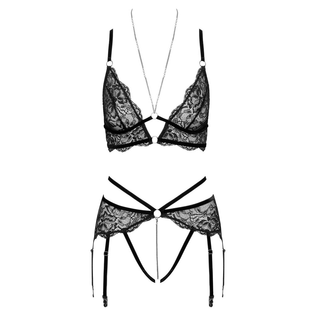 Bralette und Straps-Tanga ouvert in einem Set von Abierta Fina. Feine schwarze Stretch-Spitze und streichelweicher Samt in aufregendem Styling mit silbernen Ring- und Kettendetails. Bralette mit verstellbarer und abnehmbarer Kette als Halsausschnitt. Träger verstellbar und anpassbar. Straps-Tanga mit komplett offenem Schritt, durch den anregende Ketten führen, die auch abnehmbar sind. Die 6 Strumpfhalter und das Taillenband sind ebenfalls verstellbar.