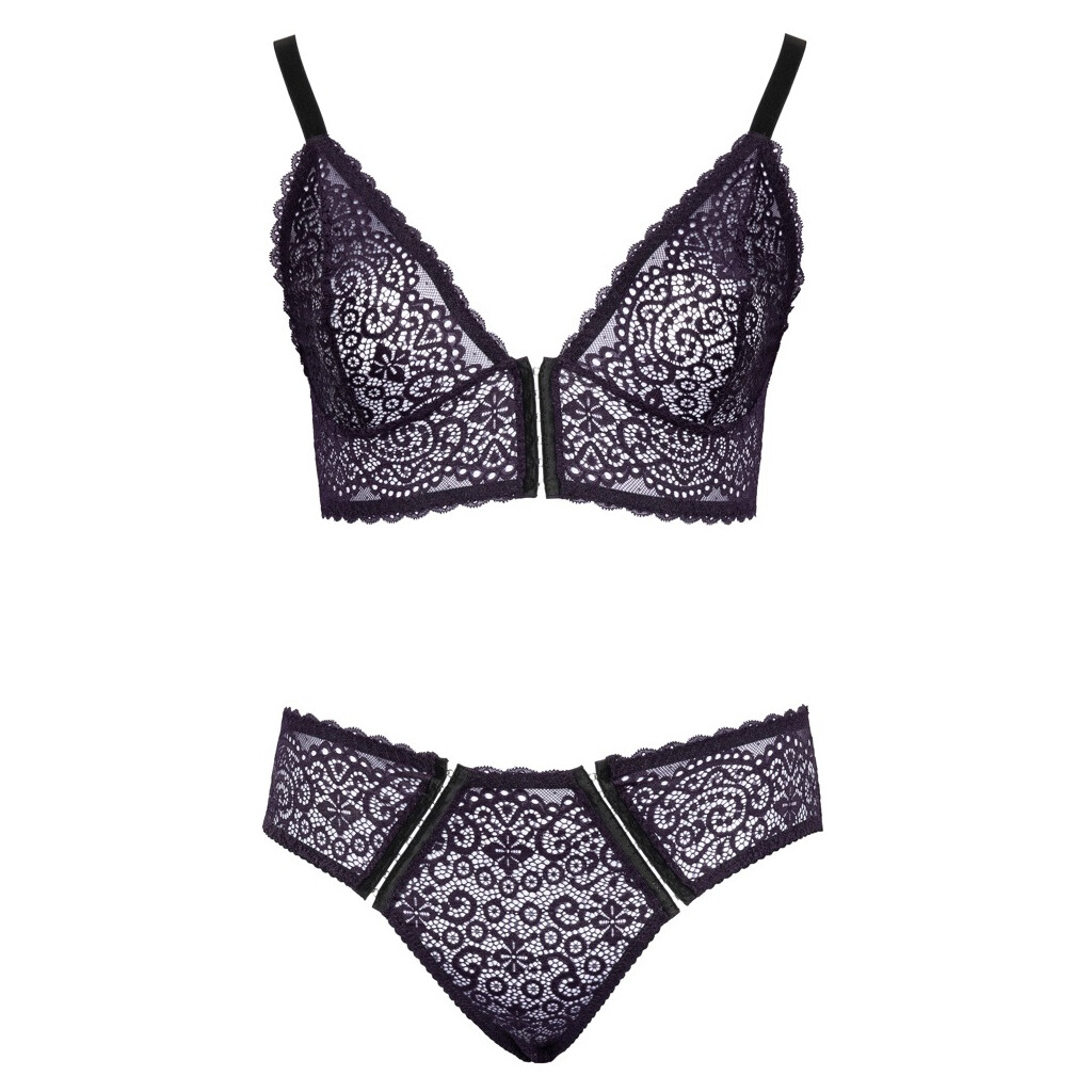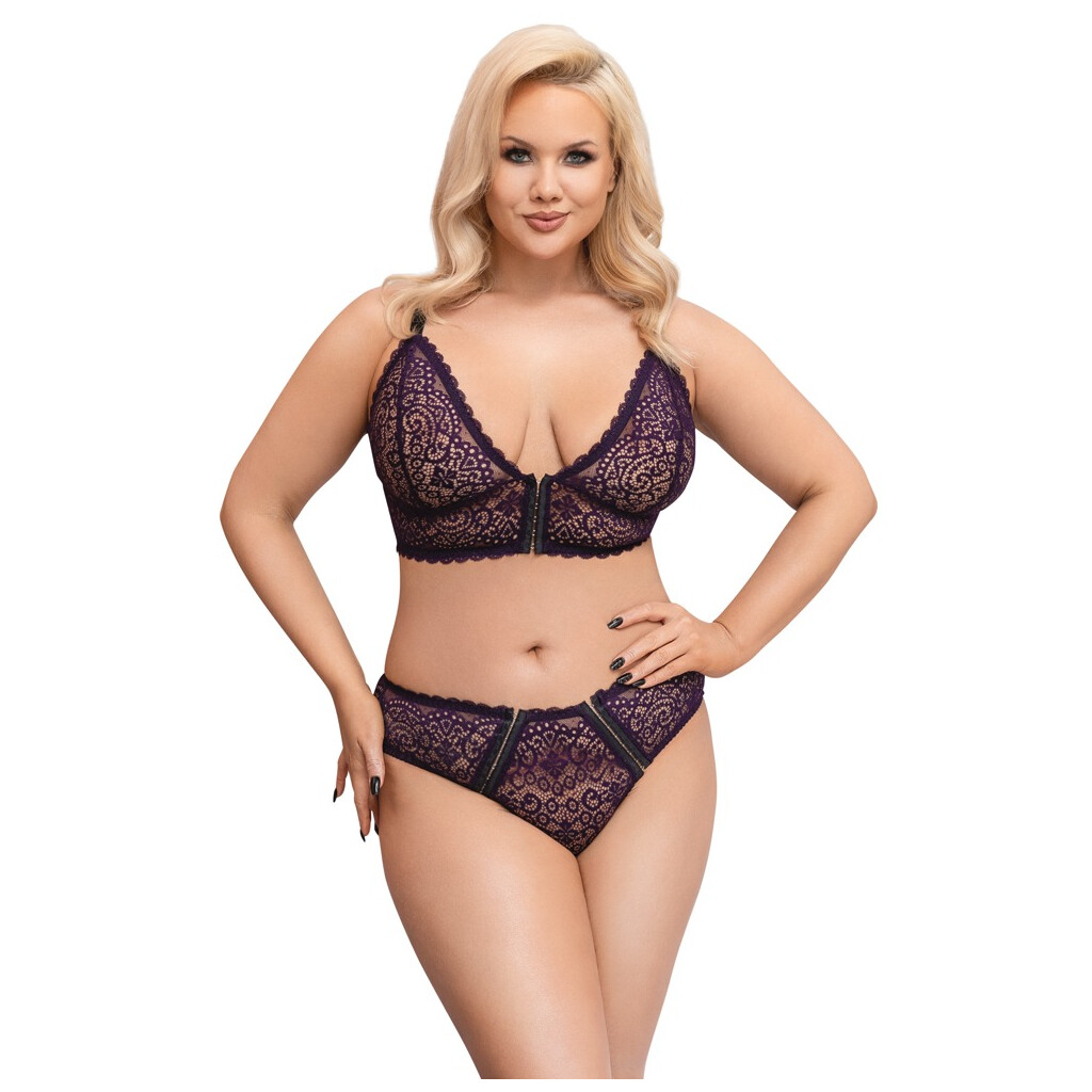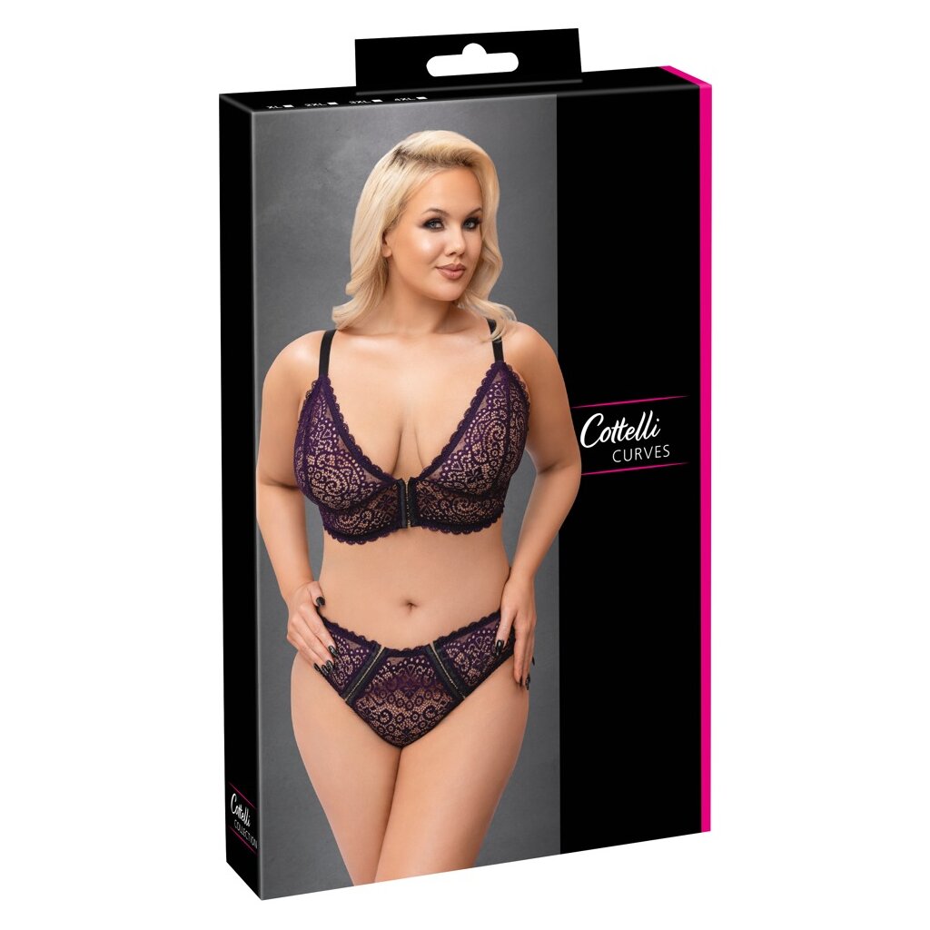 Bralette und Slip im Set von Cottelli CURVES komplett aus feiner lila Spitze. Rundum weich und elastisch für höchsten Tragekomfort. Bralette mit durchgehendem Hakenverschluss zwischen den Cups. Die Träger sind verstellbar und passen sich an. Und der Slip präsentiert sich gleich mit 2 Hakenverschlussleisten im Vorderteil, die auch komplett geöffnet werden können.