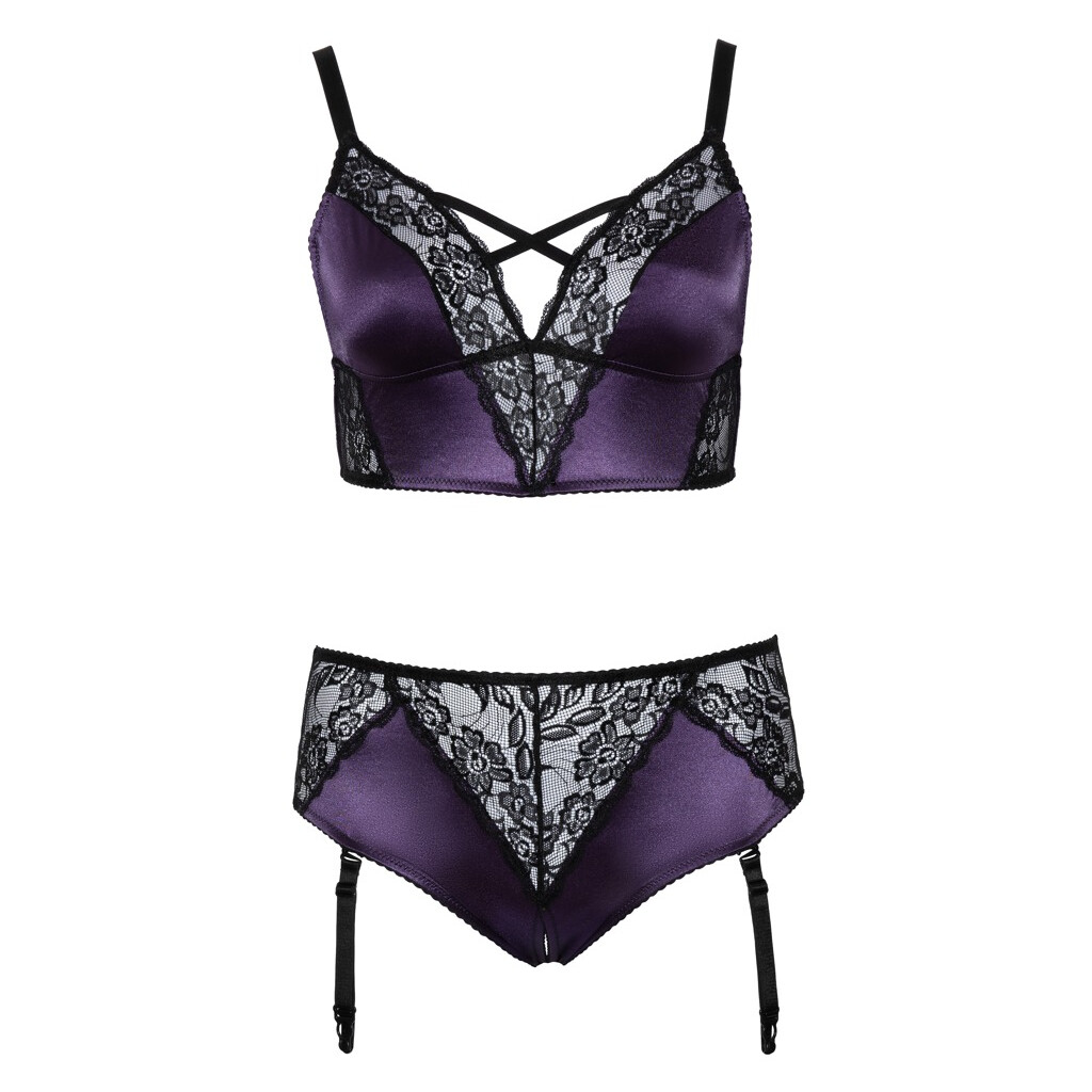 Bralette und Straps-Slip ouvert im Set von Cottelli CURVES im edlen Mix aus lilafarbenen Satin und schwarzer feiner Spitze. Das Bralette punktet mit seinen gekreuzten Stretchbändern im Dekolleté, der Taillen-Slip mit seiner einladenden Öffnung im Schritt. Die elastischen breiten Träger sind verstellbar, genauso wie die Strumpfhalter, die vom Slip auch komplett abnehmbar sind.