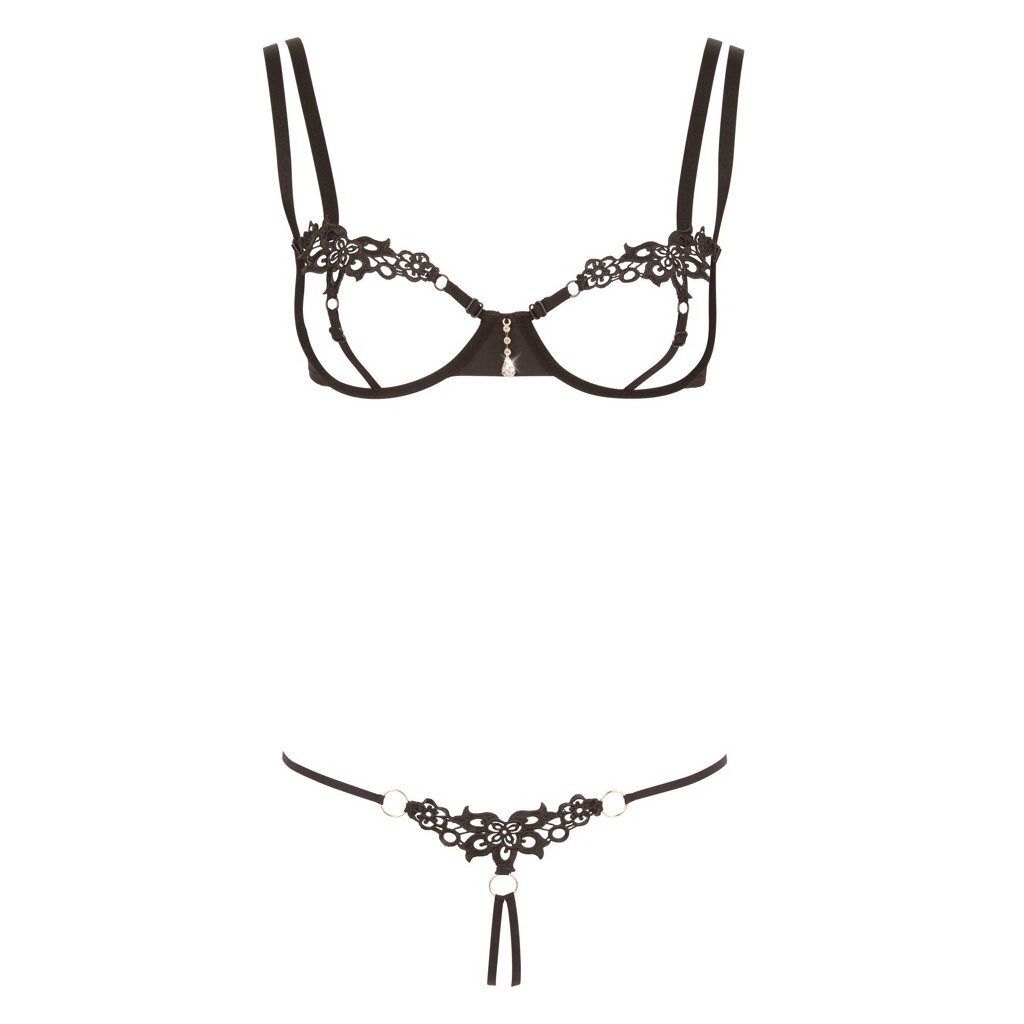 Le soutien-gorge à bonnets ouverts est juste constitué de fils et de bretelles, ce qui offre au spectateur une vue étonnante, d'autant plus que les tétons sont seulement recouverts de broderies. Il se ferme à l'aide d'un crochet dans le dos et les bretelles sont réglables. Le string assorti est ouvert à l'entrejambe et présente également de belles broderies sur le devant. La broderie est reliée aux bretelles par trois petits anneaux de couleur argentée.