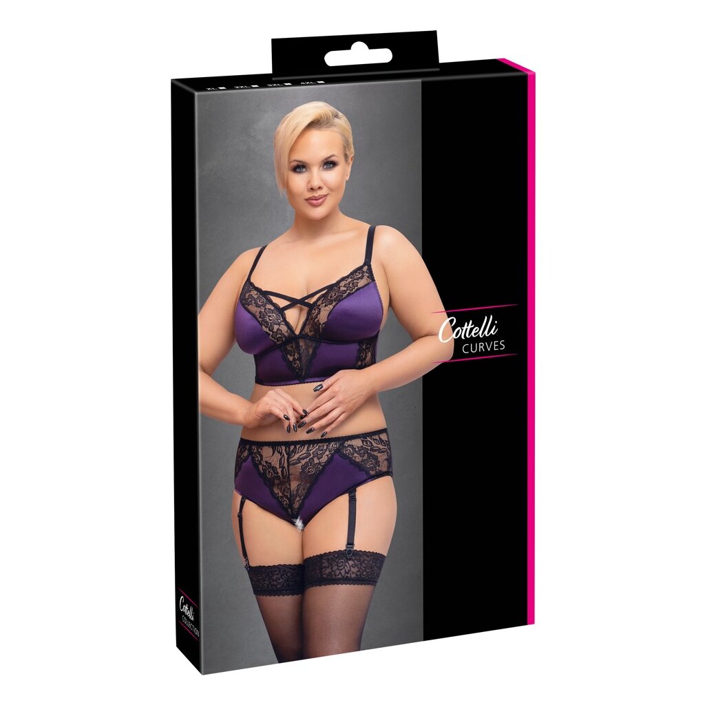 Bralette et culotte à jarretelles ouvertes dans l'ensemble de Cottelli CURVES dans le noble mélange de satin violet et de dentelle fine noire. La bralette marque avec ses bandes stretch croisées dans le décolleté, la culotte-jarretelle avec son ouverture invitante à l'entrejambe. Les larges bretelles élastiques sont réglables, tout comme les jarretelles, qui sont également entièrement détachables du slip.