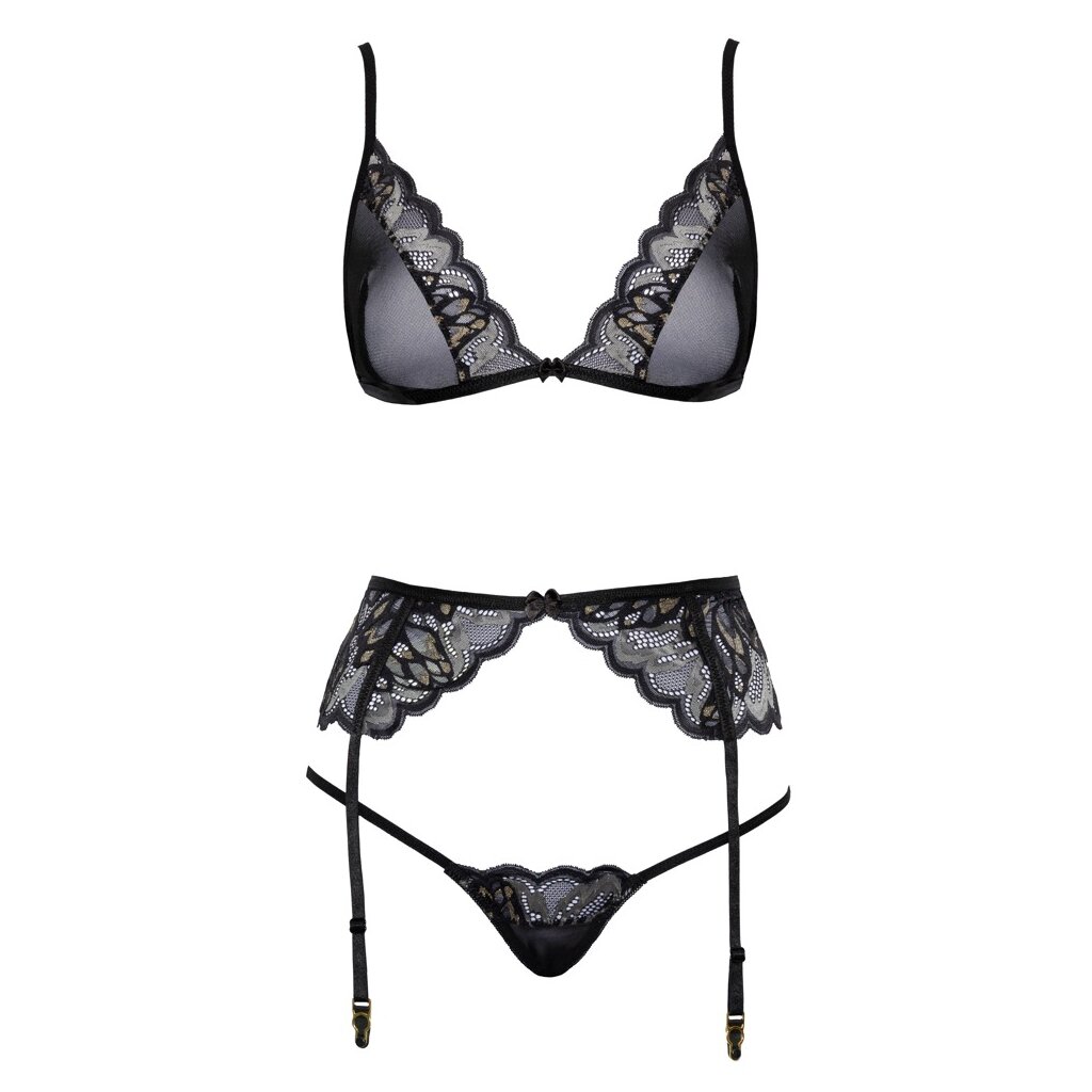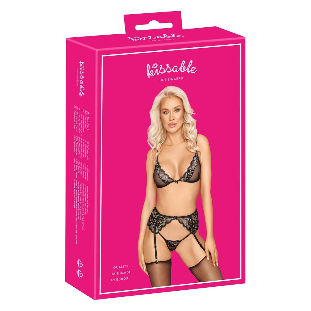 Soutien-gorge doux, porte-jarretelles et string dans un ensemble kissable fait de dentelle à effet précieuse mélangée avec du powernet. Tout autour, doux et élastique pour un confort maximal. Soutien-gorge avec bretelles réglables et fermeture à crochets dans le dos, tout comme le porte-jarretelles avec ses porte-jarretelles réglables. Le petit string sophistiqué séduit avec ses deux fines lanières extensibles qui se rejoignent à l'entrejambe.