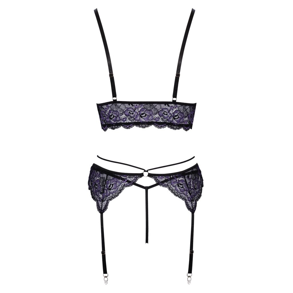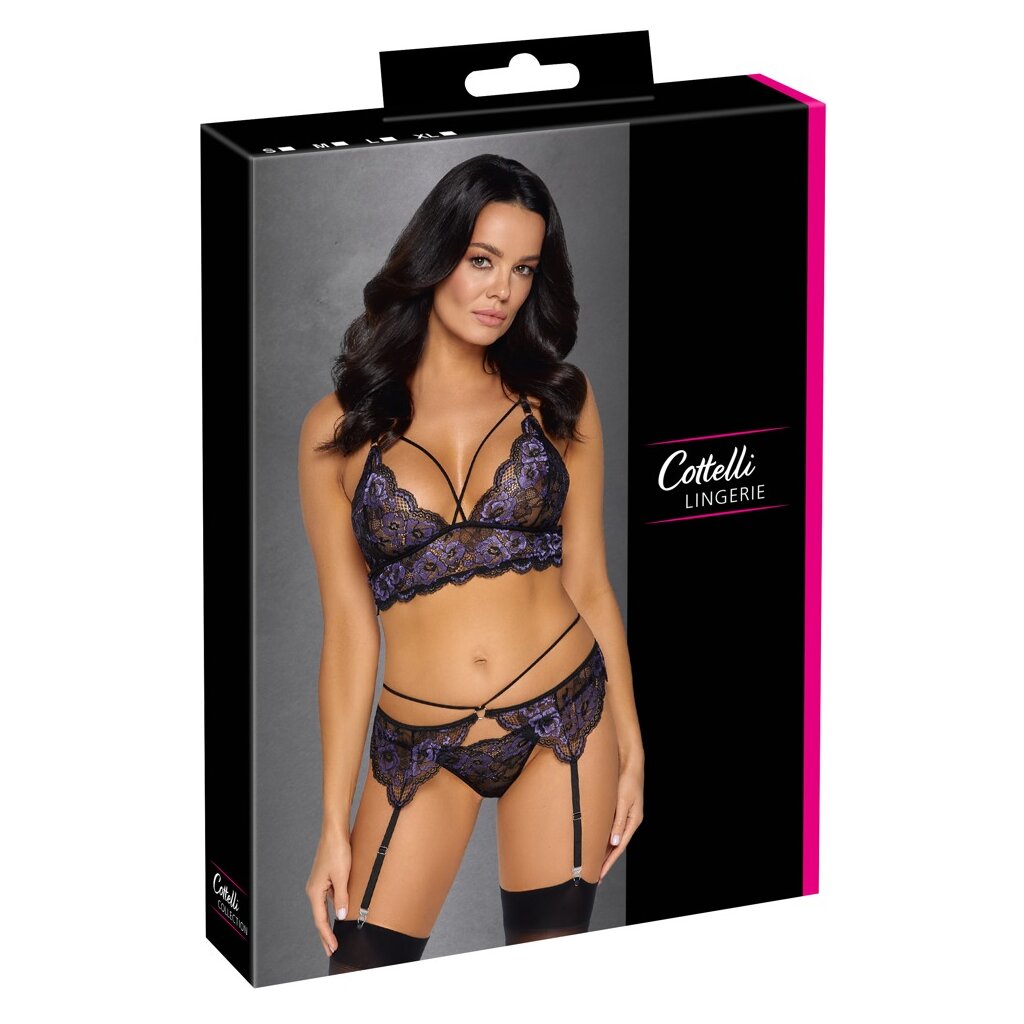 Bralette, Strapsgurt und String im Set von Cottelli LINGERIE. Alles komplett aus 2-farbiger Blütenspitze – schön weich und elastisch für hohen Tragekomfort. Verschlussfreies Bralette mit gekreuzten Stretchriemchen zwischen den Soft-Cups. Am Strapsgurt ebenfalls ein dekoratives Stretchriemchen in der Taille. Die Träger und Strumpfhalter sind passend verstellbar. Der kleine feine Spitzen-String komplettiert dann dieses schöne Set.