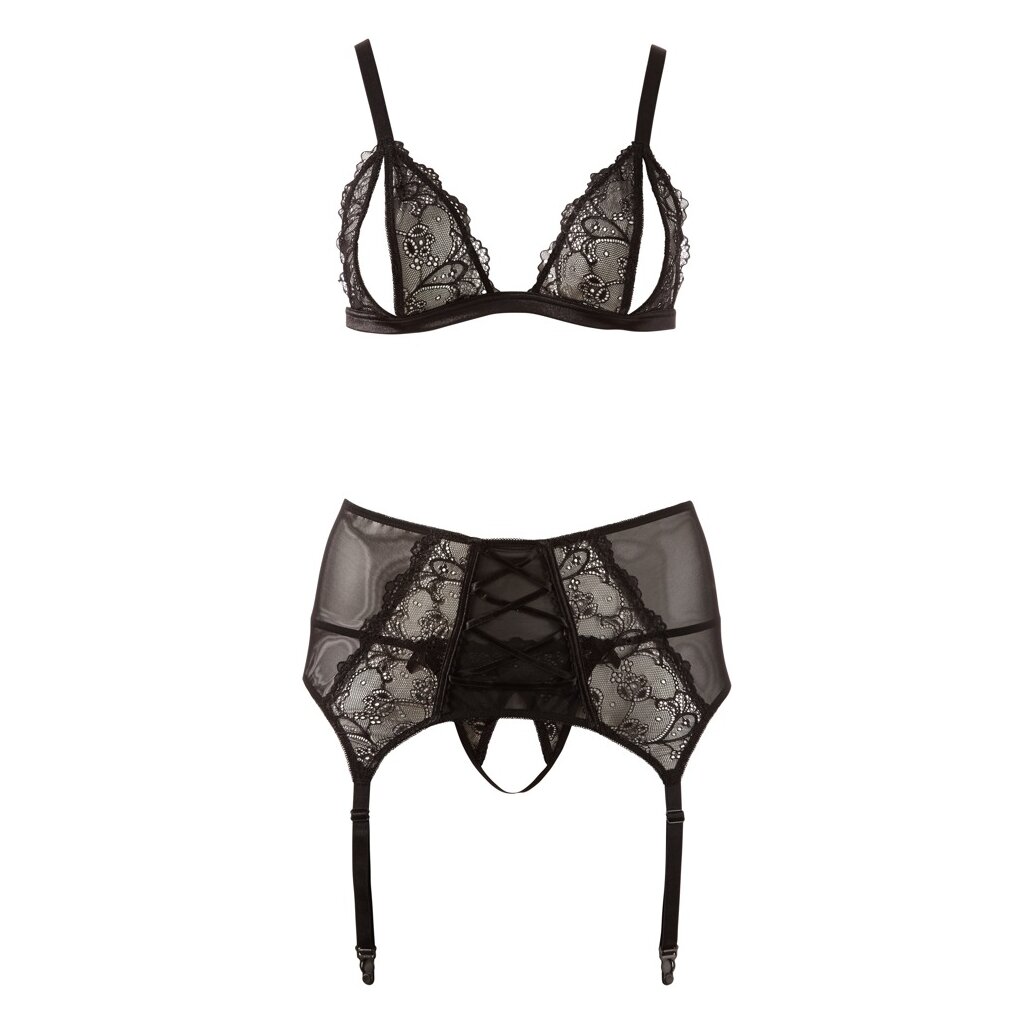 Spitzen-Set zum Verlieben! Soft-BH mit offenen Cups, verstellbaren Trägern und Hakenverschluss hinten. Strapsgürtel mit Zierschnürungen und vier verstellbaren Strapsen. Dazu passender String. 90% Polyamid, 10% Elasthan. Ohne Strümpfe.