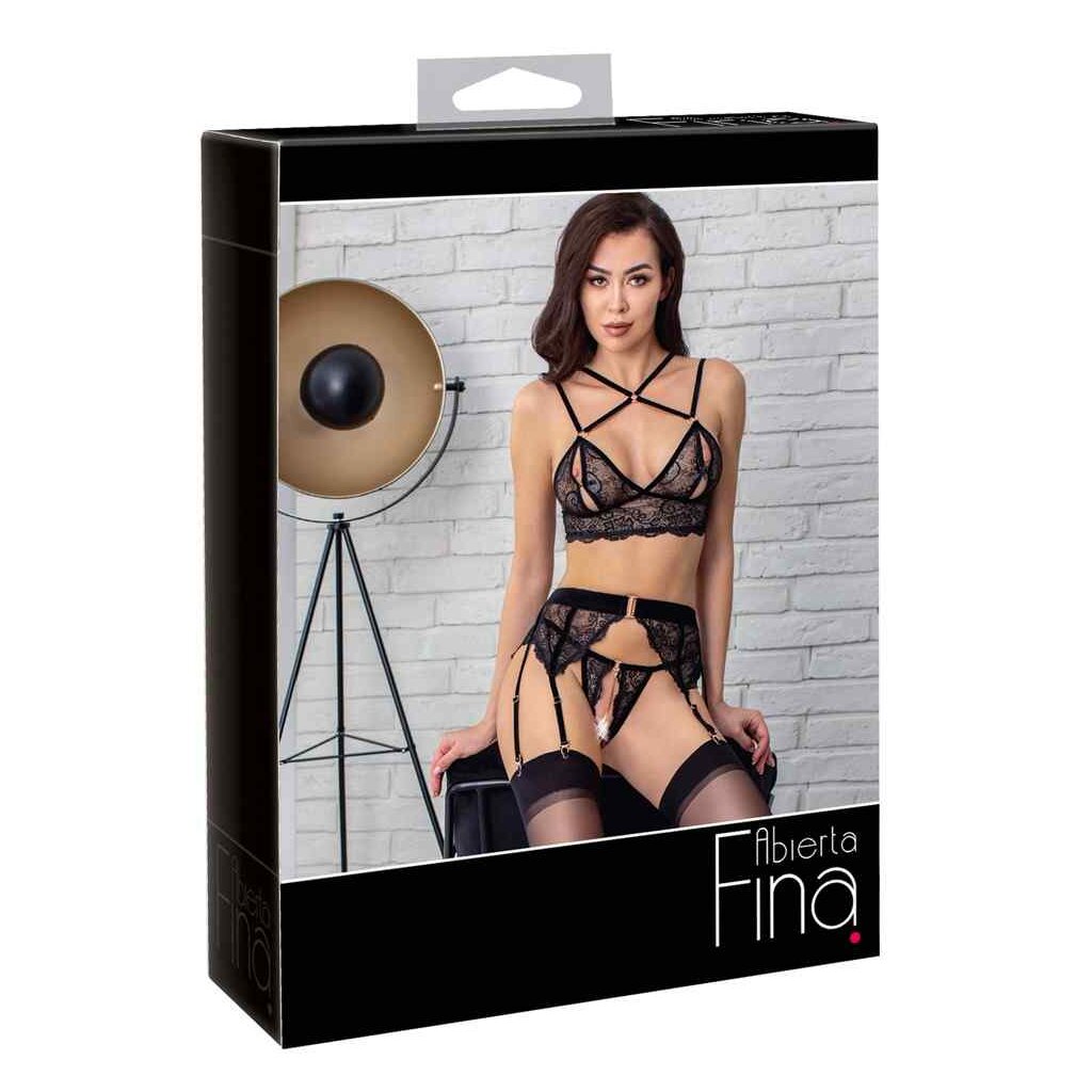 Soutien-gorge, porte-jarretelles et string sans entrejambe de la marque Abierta Fina en dentelle noire extensible avec des détails en velours et des accessoires couleur or rose. Le soutien-gorge est plus long que les soutiens-gorge normaux et possède des bonnets fendus avec de petites fermetures à crochets sous les nœuds en satin. Il y a également une fermeture à crochets dans le dos. Les doubles bretelles réglables en velours s'entrecroisent au niveau du décolleté et se transforment en quatre bretelles à l'arrière. Le porte-jarretelles a une ceinture en velours et un anneau décoratif à l'avant. Le porte-jarretelles a également une fermeture à crochets à l'arrière. Les 6 bretelles peuvent être ajustées. Le string assorti est complètement sans entrejambe et possède une chaîne amovible au-dessus de l'entrejambe.