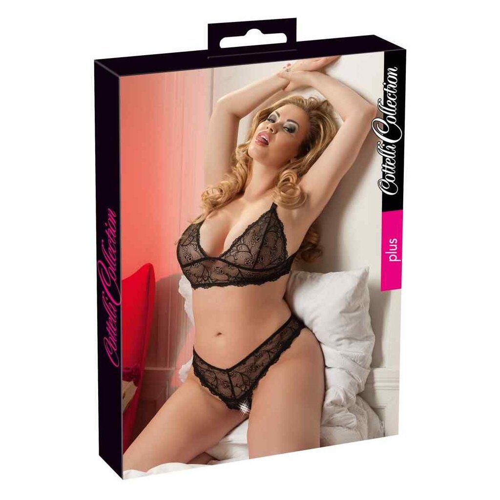 Verführung auf die Spitze getrieben! Filigrane schwarze Spitze: zarter Soft-BH ohne Verschluss und mit verstellbaren Trägern plus raffinierter String mit offenem Schritt für leidenschaftliche Stunden zu zweit. 90% Polyamid, 10% Elasthan.