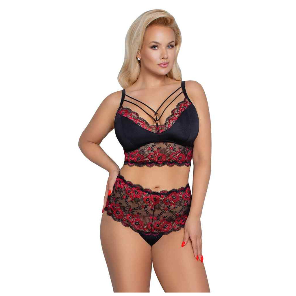 Softer BH und Slip in blickdichtem Schwarz mit edler 2-farbiger Blütenspitze. Der BH ist im Dekolleté mit dekorativen Stretchbändern und zwei goldfarbenen Ringen ausgestattet, die elastischen Träger sind für perfekte Passform in der Länge verstellbar. Der Taillen-Slip punktet mit seinem modischen High Waist-Bund komplett aus Spitze.