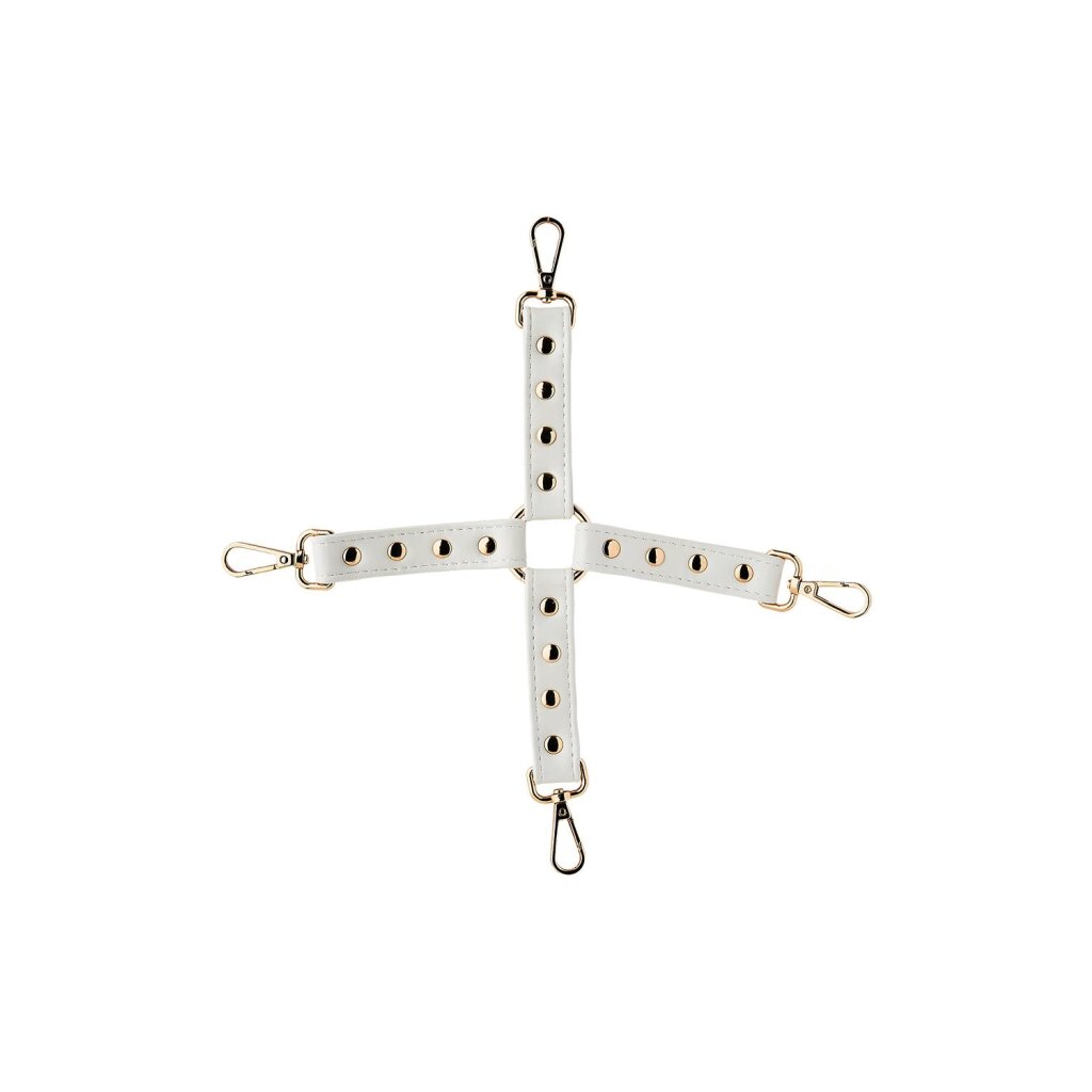 This Hog Tie from the Blaze Elite collection is made of white faux leather with gold-tone metal details that make it look very stylish. Expand your bondage play with a Hog Tie to secure your sub's arms and legs. You can attach chains, ropes, handcuffs, ankle cuffs and other bondage accessories to the 4 musket hooks, for example the matching hand and ankle cuffs from the Blaze Elite collection. Made of white faux leather / With gold-coloured metal details, nickel-free / With 4 locking hooks