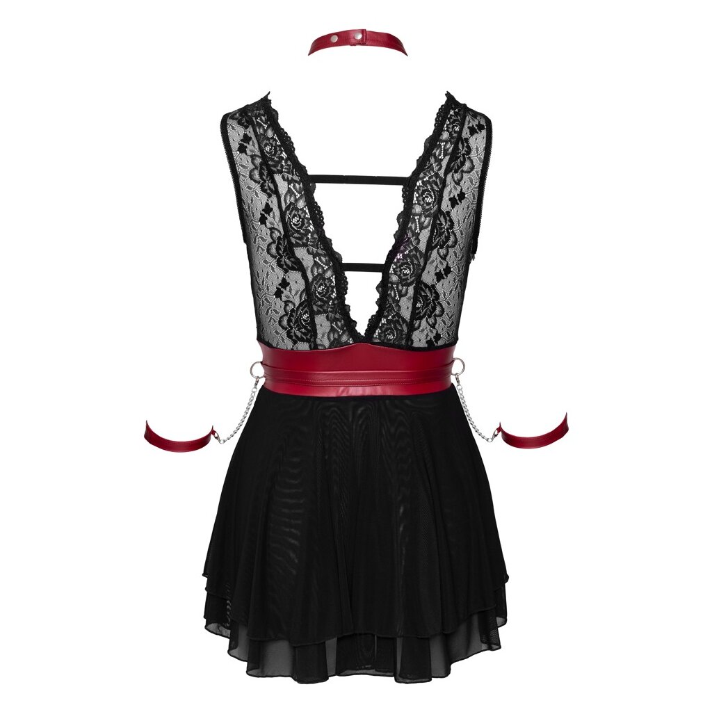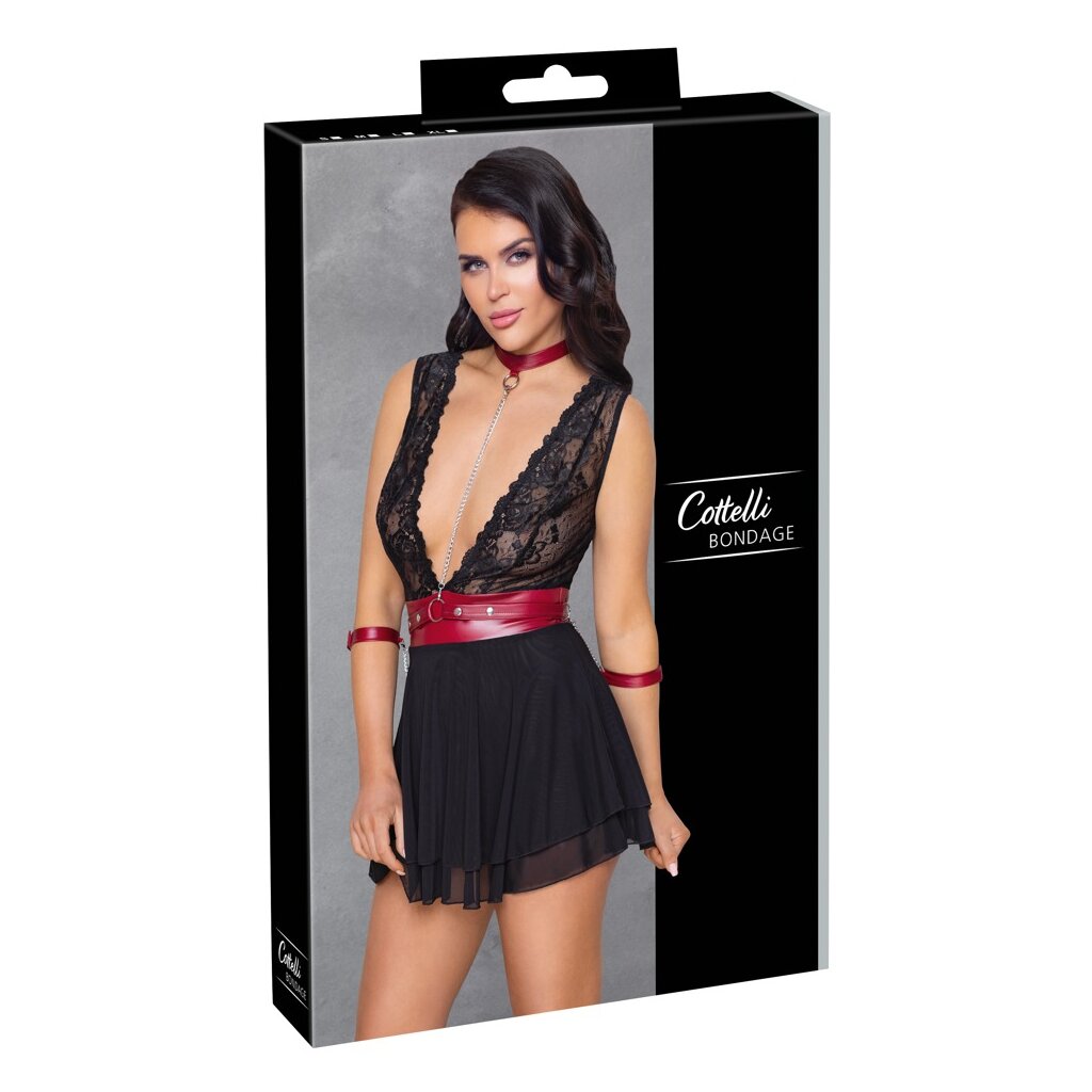 Short black babydoll by Cottelli BONDAGE in a mix of delicate lace (top) and fine powernet (skirt) with waist-accentuating contrast insert in a noble red matt look. And also the belt with its two handcuff straps on carbine chains and the necklace come in red matt look. The babydoll is cut extra low in the front as well as in the back, the flared skirt is worked in two layers. At the collar with snap fastener can be hooked into the ring in front the enclosed carabiner chain. The belt and the handcuff straps with Velcro fasteners are suitably adjustable and also completely removable.