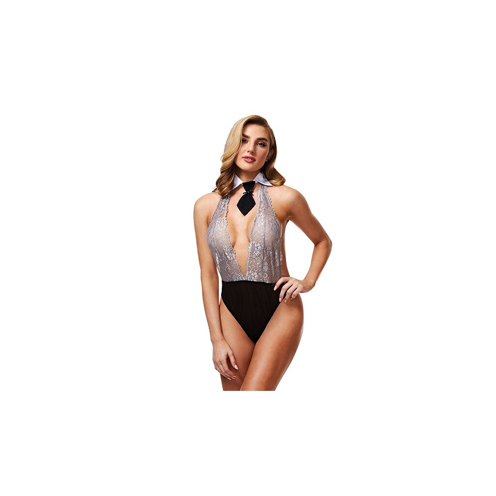 Le parfait nounours d'écolière, et nous ne parlons pas d'un ours ! Ce nounours au design provocant a de la dentelle argentée coupée en V profond jusqu'à la taille et un string noir en bas qui remonte haut sur les hanches. Complétez le look avec le collier avec une cravate d'écolière ludique. Onesize / Composition du matériau : 90% nylon, 10% élasthanne