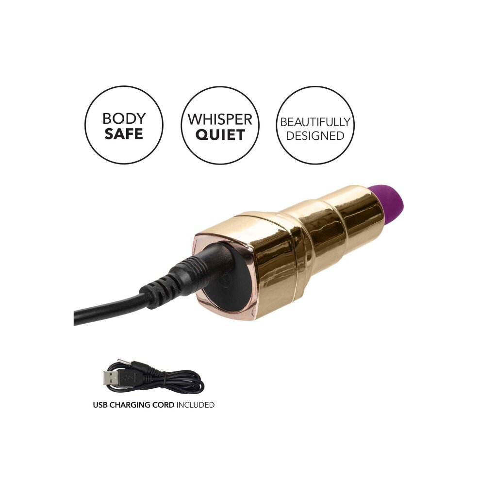 Regardez comme le Naughty Bits™ Bad Bitch™ Lipstick Vibrator lance votre nouvelle teinte préférée ! L'éblouissant design rouge à lèvres doré, les 10 puissantes fonctions de vibration et le moteur en tungstène silencieux sont faits pour vibrer partout où vos aventures vous mènent. L'embout angulaire est conçu pour offrir une stimulation ponctuelle ou une pulsation en contact total avec vos points de plaisir préférés. Les débutants et les experts en érotisme adoreront les vibrations puissantes émises par le moteur silencieux. Faites défiler les 10 fonctions de vibration à haute intensité avec le bouton en silicone élégant et maintenez-le enfoncé pendant 3 secondes pour l'activer ou le désactiver. La collection Naughty Bits™ est faite pour se démarquer dans n'importe quelle table de nuit avec des designs accrocheurs et des fonctions orgasmiques. Le silicone ultra pelucheux et les détails dorés épurés de ce superbe mini masseur feront sourire même l'amant le plus élégant avant et après.Chargez votre passion en seulement 2 heures en branchant le câble USB fourni dans le port de charge auto-obturant à l'arrière du masseur. Embrassez jusqu'à 2 heures de vibrations à basse vitesse et 1 heure à haute vitesse. La taille discrète du masseur de 4 pouces en fait le compagnon de voyage idéal, vous permettant d'embrasser un plaisir rayonnant partout où vos fantasmes vous mènent.