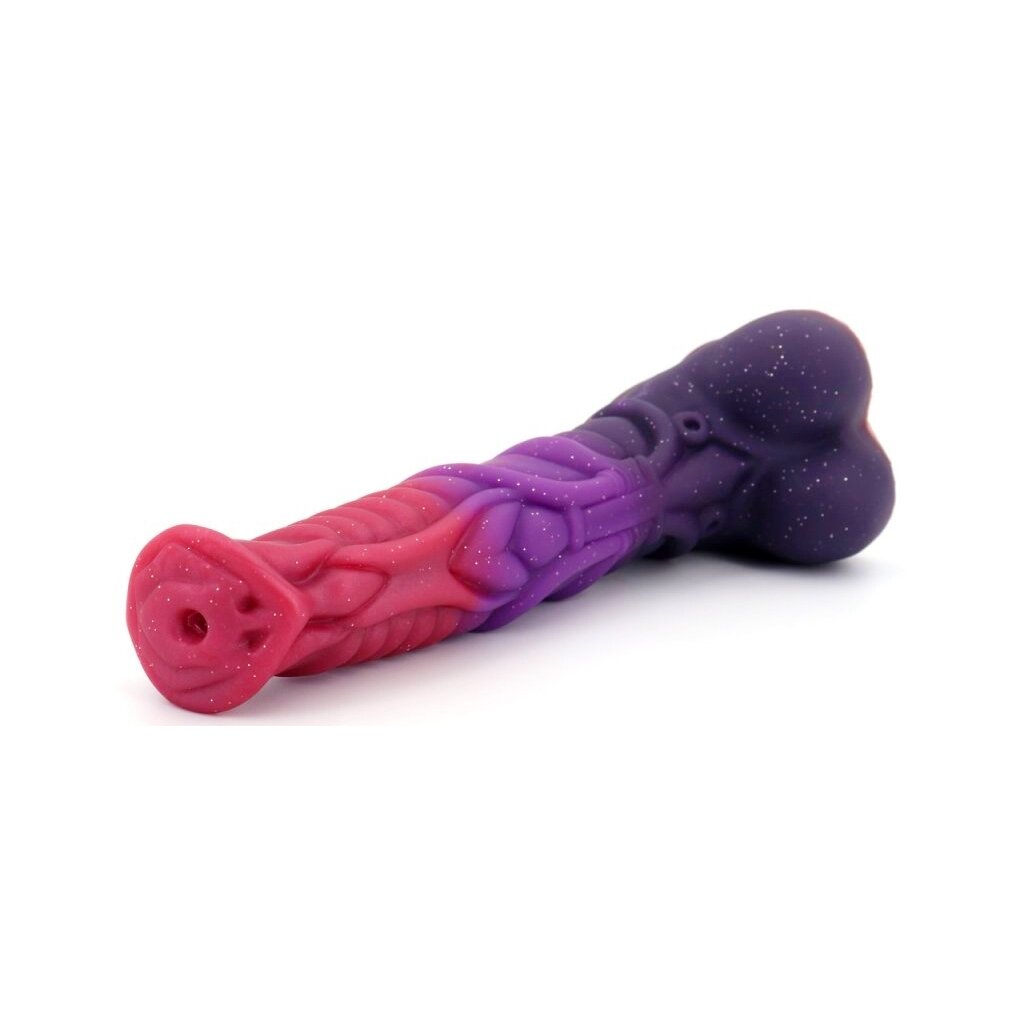 The Galactic horse dildo from Bad Demon is an exciting sex toy that immediately catches the eye with its unique shape and eye-catching colors in pink and purple with glitter accents. The shape of the dildo, which is reminiscent of a horse's sex, gives it a special aesthetic. With an insertable length of 19 cm and a maximum width of 5 cm at the glans and base, the dildo provides intense stimulation. The textured surface and artificial veins provide additional stimulation during use. The practical suction cup base makes it possible to attach the dildo to smooth surfaces. Made from skin-friendly silicone, the Galactic horse dildo is comfortable to use and easy to clean. Immerse yourself in a galactic world full of lust and pleasure with this exciting toy