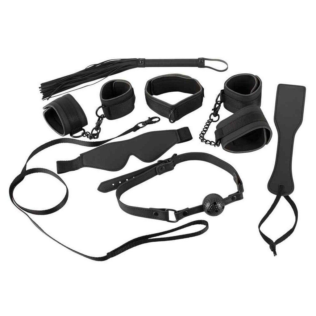 Mit diesem Set ist man gleich von Anfang an bestens ausgerüstet, um eine Erkundungstour in den Bereich des BDSM zu machen. Halsband mit Leine, Augenmaske, Mundknebel, Peitsche, Paddel, Hand- und Fußfesseln sind aus Lederimitat und fühlen sich sensationell auf der Haut an. Alle Elemente des Sets sind verstellbar und der Mundknebel ist ausgestattet mit Luftlöchern.