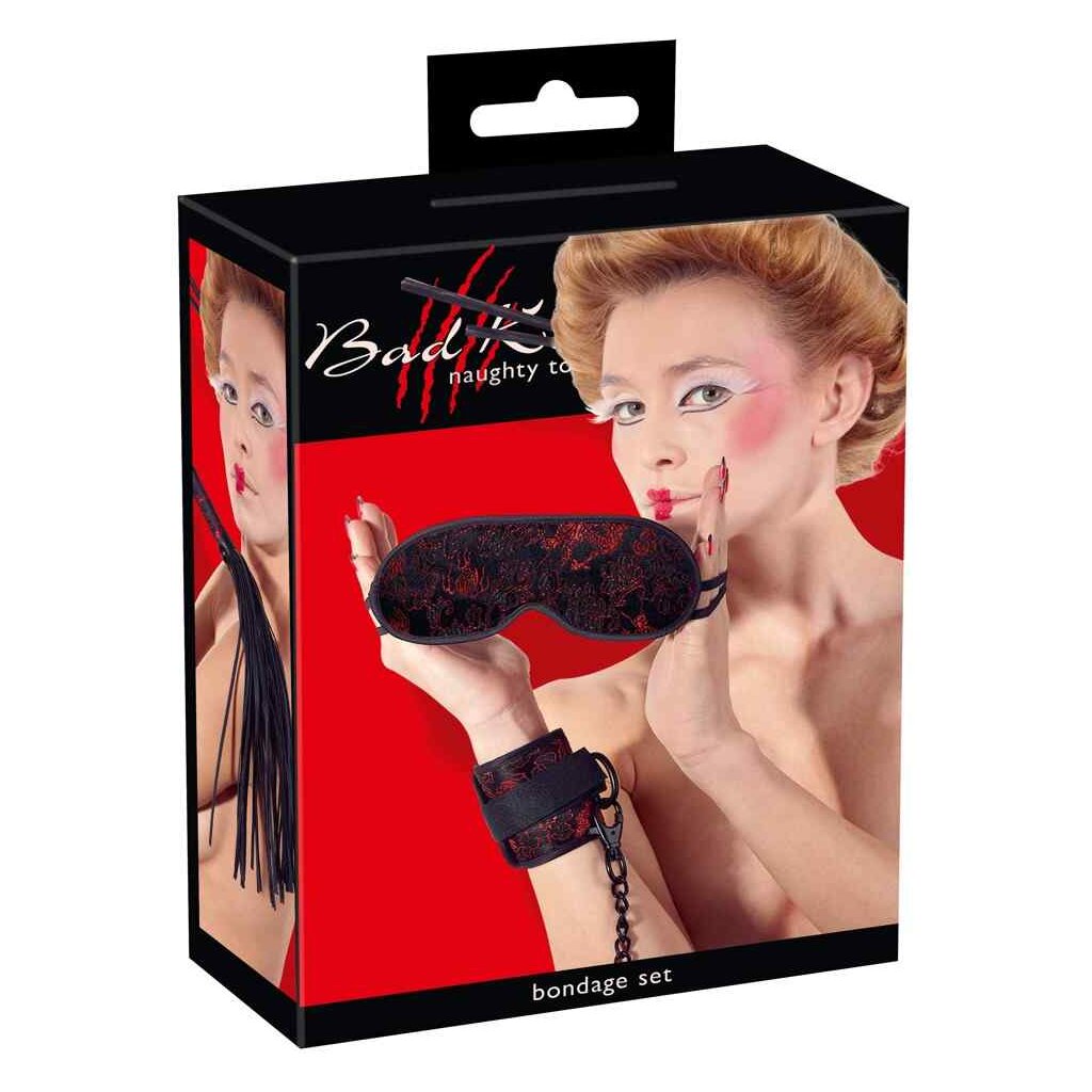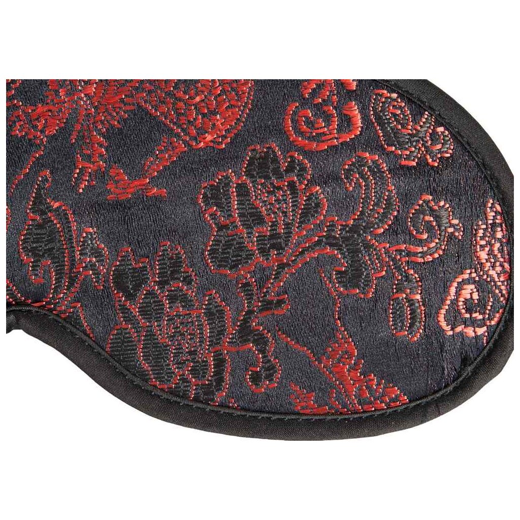 Alles dabei für eine Nacht mit asiatischem Zauber! Dreiteiliges Set aus schwarzem Satin mit eingewebtem Muster in Rot: Handfesseln mit Klettverschluss, Augenmaske und 38 cm lange Peitsche mit Lederimitat-Striemen.