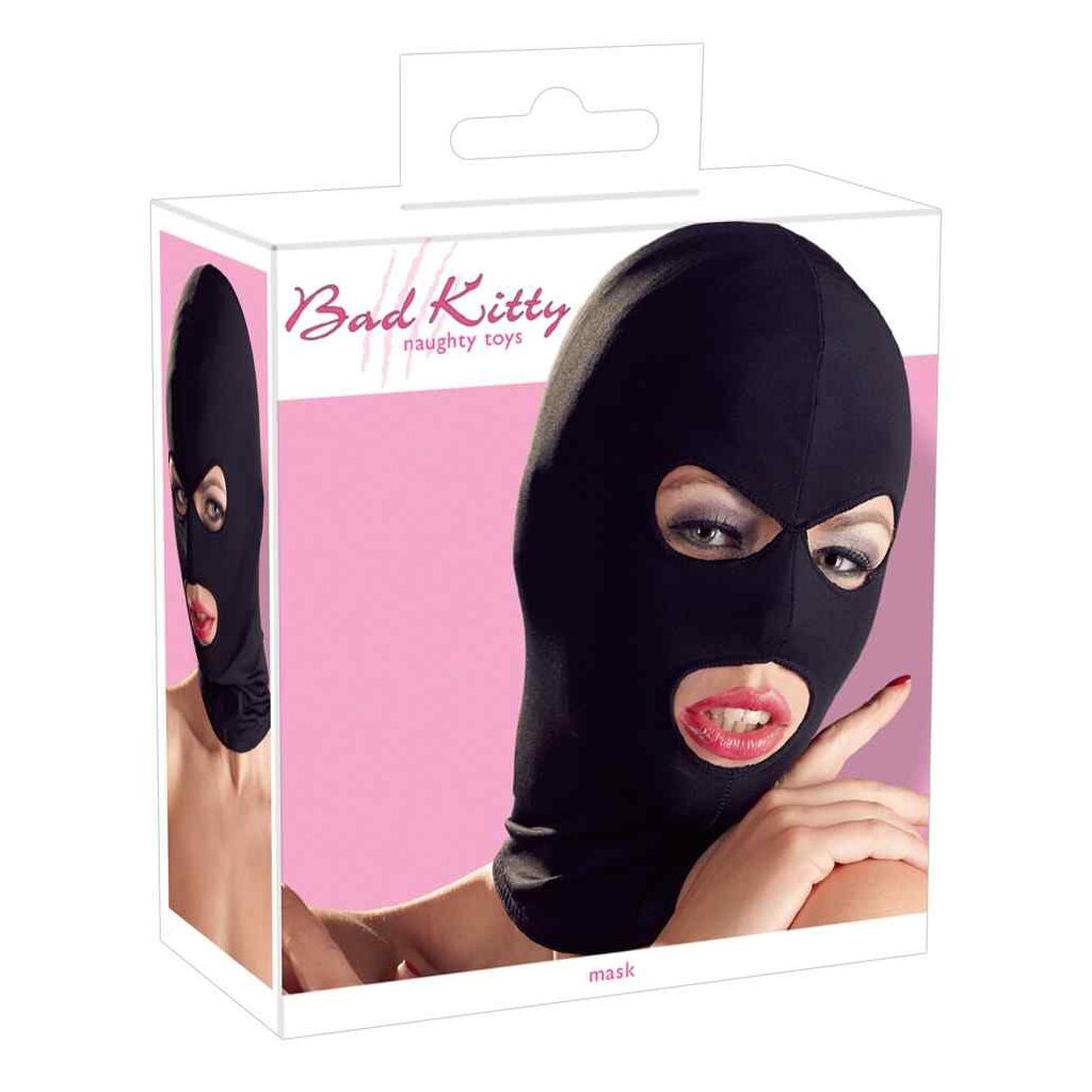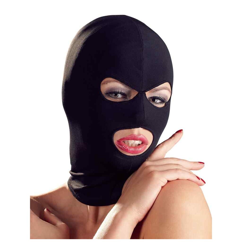 Schwarze, eng anliegende Kopfmaske aus elastischem Stoff. Augen und Mund sind frei. 92% Polyester, 8% Elasthan.