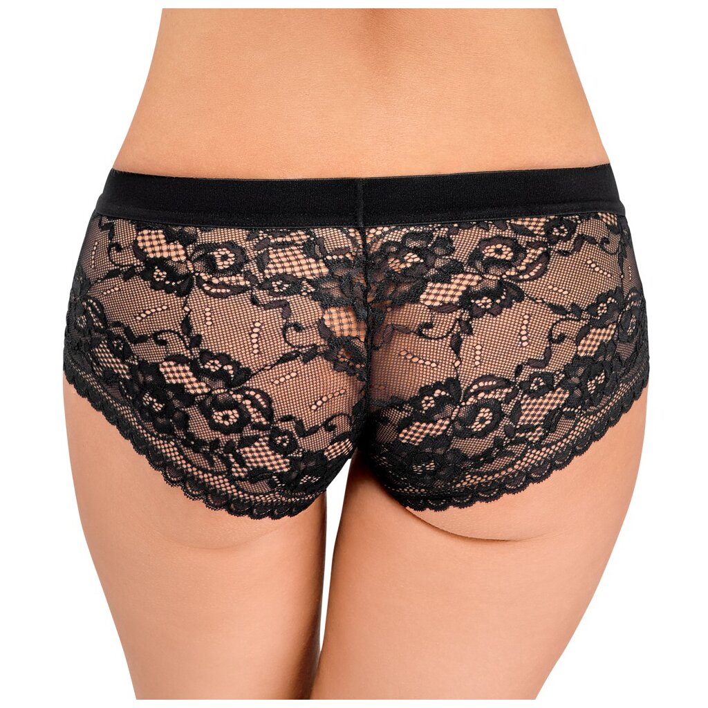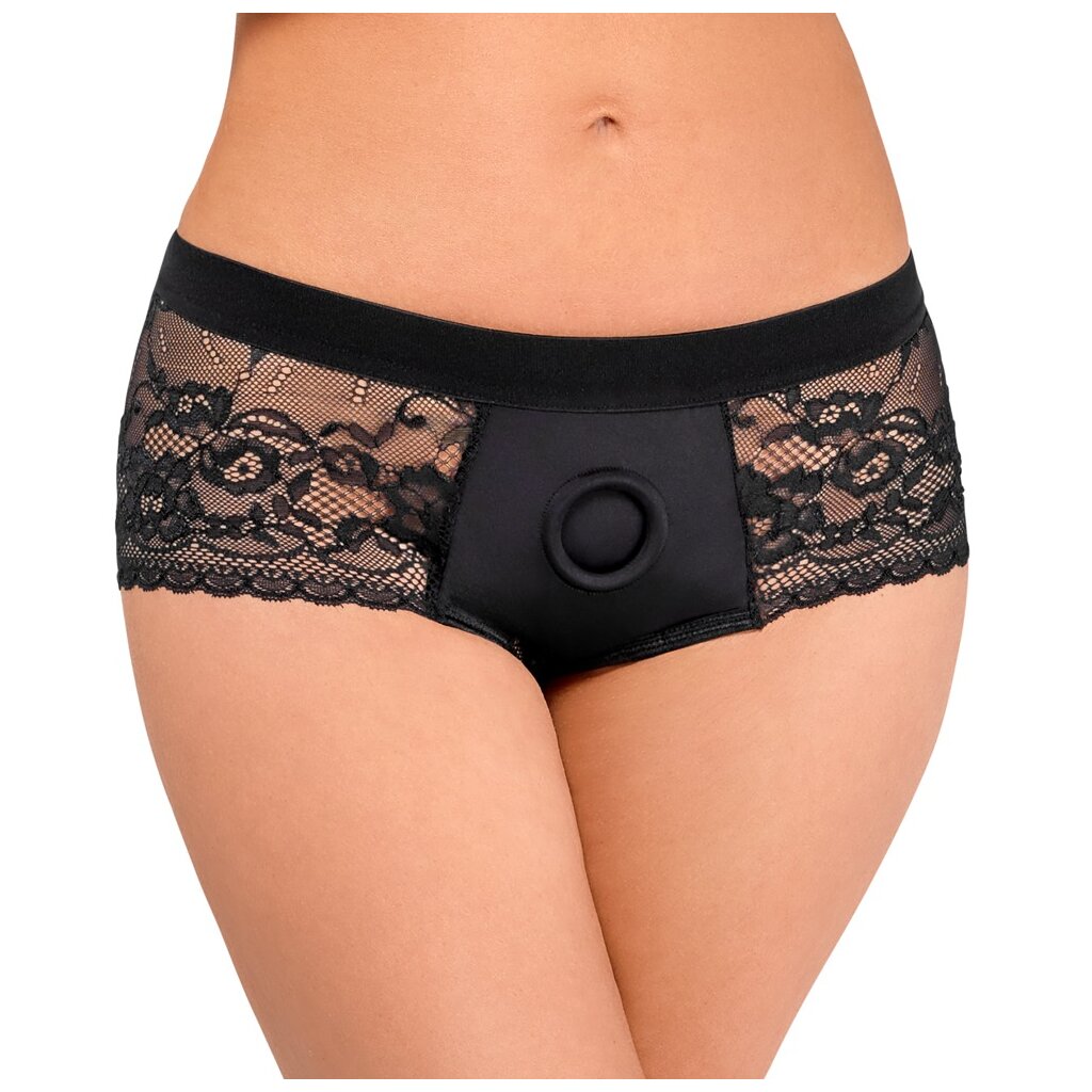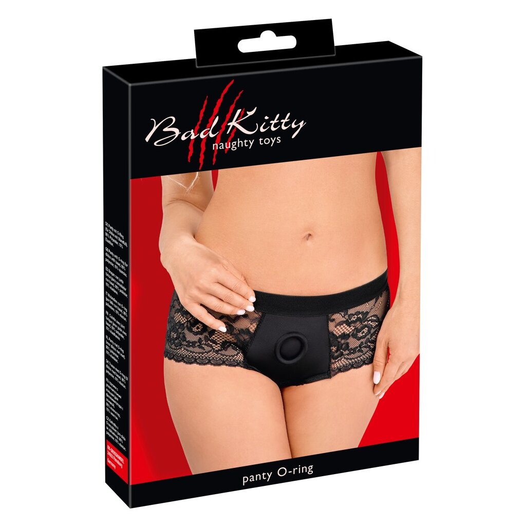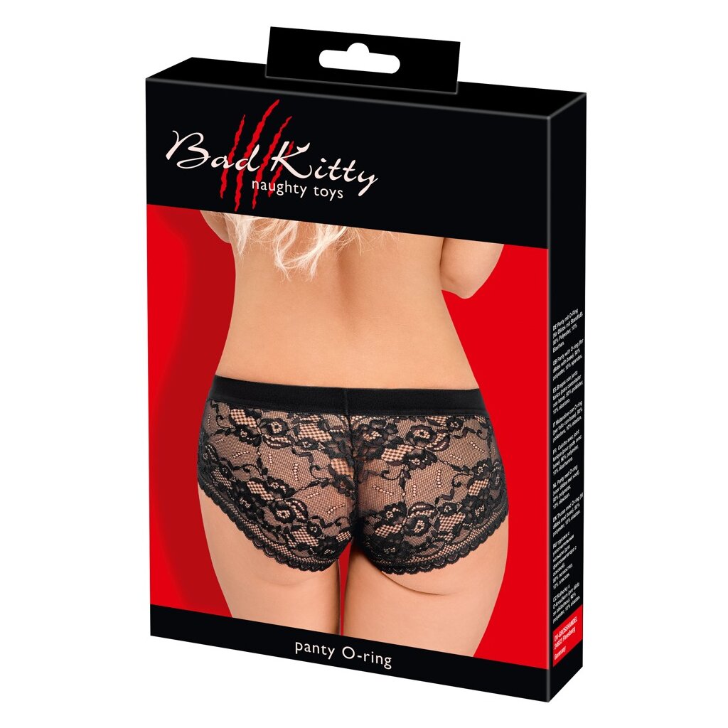 Black O-Ring panty from Bad Kitty in beautiful floral lace. Front with opaque microfibre insert and integrated stretch support ring (Ø 3.5cm) for inserting a dildo/vibrator with foot/sucker. Soft elastic all round with a comfortable stretch waistband for great comfort.