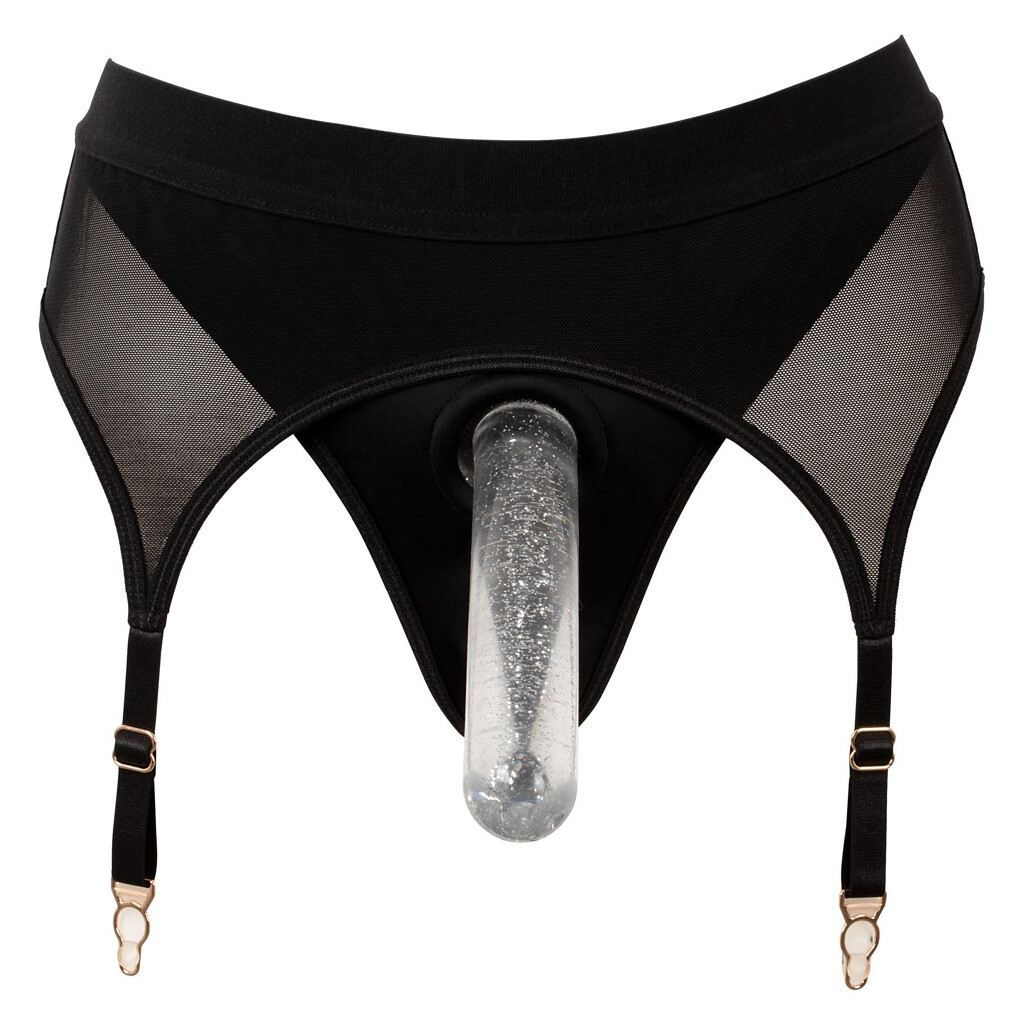 Schwarzer Strap-On-Tanga von Bad Kitty. Der Tanga ist vorne doppellagig und hat einen Schlitz sowie einen sorgfältig eingearbeiteten Stretchhaltering (Ø 3,5 cm) zum Einführen eines Dildos/Vibrators mit Stand-/Saugfuß. Die Strapshalter sind in der Passform verstellbar.