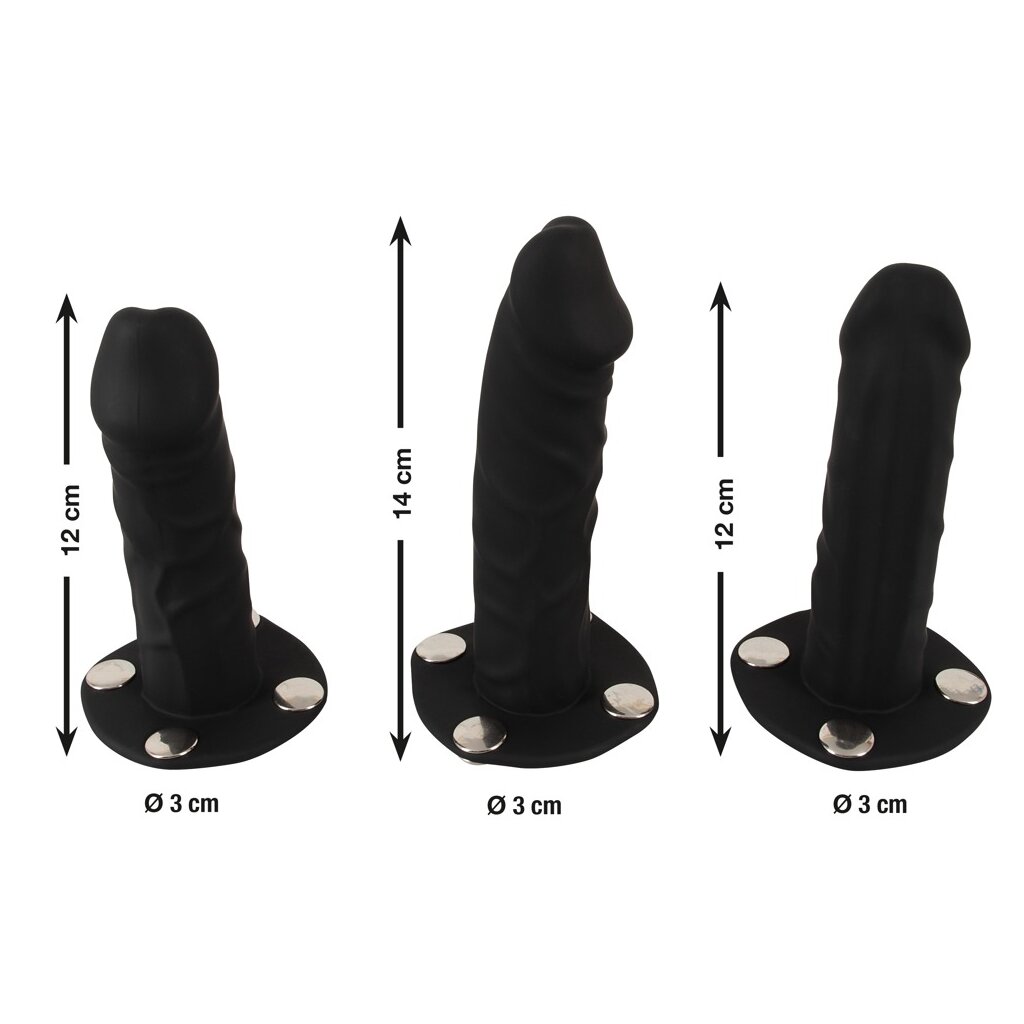 String de Bad Kitty au look cuir élégant comprenant 3 godes en silicone de tailles différentes, qui peuvent être facilement insérés ou remplacés à l'avant du string et dans l'entrejambe à l'aide de boutons-pression. Le string peut être ajusté sur le côté à l'aide de fermetures à boucle.