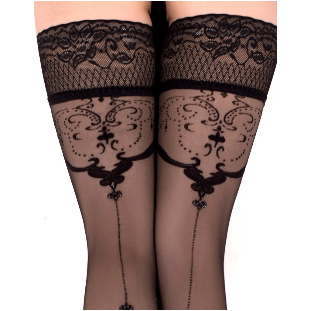 Die schwarze Farbe der Strümpfe sorgt für einen eleganten und zeitlosen Look. Die schwarze Stickerei auf der Beinrückseite dient als dekoratives Element und wertet die Beine optisch auf. Die Materialkombination hat einen außergewöhnlichen ästhetischen Wert und sorgt für Komfort und angenehmes Tragen. Größe L/XL / Materialzusammensetzung: 82% Polyamid, 18% Elasthan