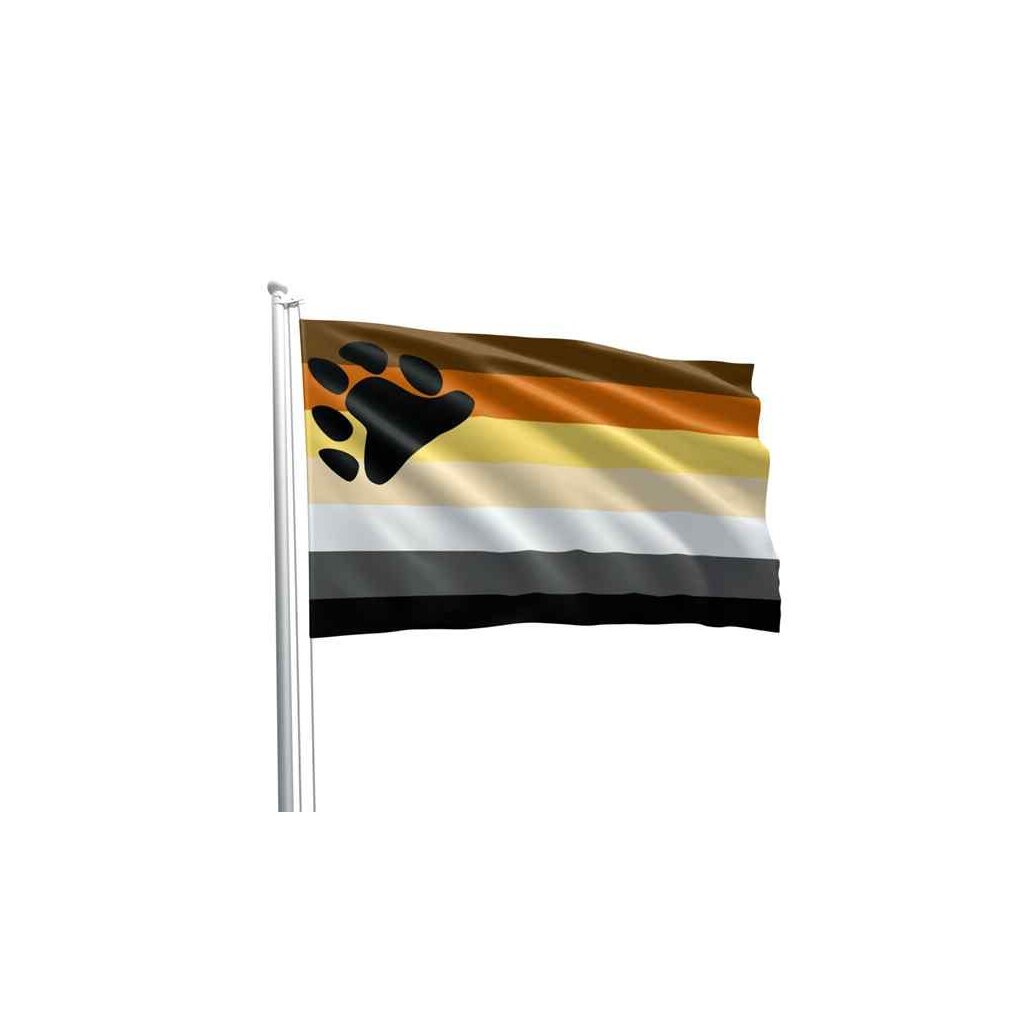 Be a proud bear with this large, light yet sturdy Bear Pride Flag! Trademarked in 1995, the colours used in the design of the flag are meant to represent the furs of animal bears around the world. Contrary to popular belief, they do not refer to human skin colours. Dark brown, orange/rust, golden yellow, tan, white, grey and black. The layout of stripes with the bear paw at the corner is similar to, and likely inspired by, the combination of the Leather Pride Flag and Pride Flag designs.