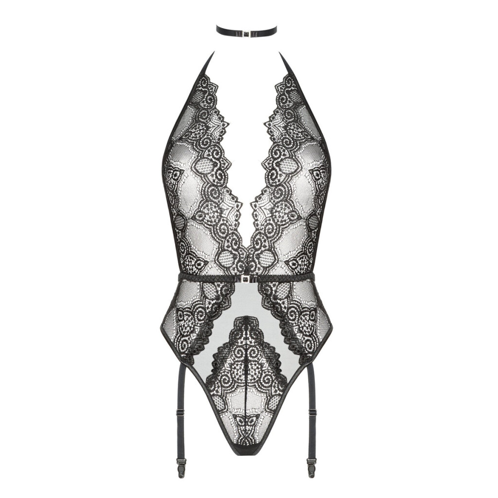 • Sensual halterneck stringbody (adjustable at the neck and with clip closure to close) made of high quality lace combined with delicate tulle