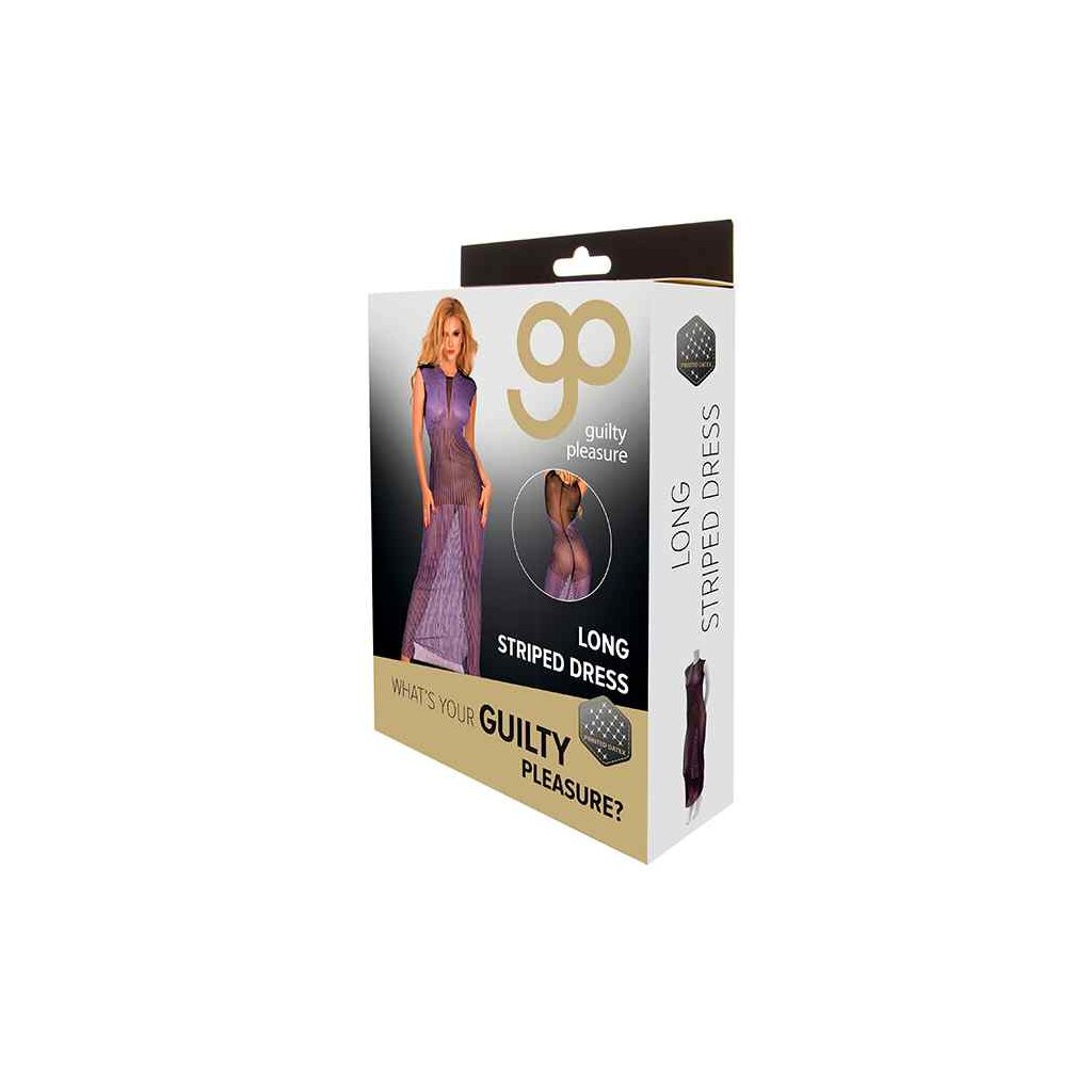 Spektakuläres Outfit, dieses bedruckte Datex-Kleid mit Streifenmuster in Lila! Die mit Latex bedruckten Streifen erlauben es, durch den transparenten schwarzen Stoff hindurchzusehen. Auf der Vorderseite gibt es einen V-förmigen Bereich ohne Druck und auf der Rückseite treffen die Streifen von der linken und rechten Seite an der Taille zusammen. Aufgrund des dehnbaren Materials, auf das sie gedruckt sind, passen sich die Streifen allen Kurven des Körpers an. Es gibt keine Reißverschlüsse oder andere Verschlüsse, da das Material sehr elastisch und flexibel ist. So lässt sich das Kleid leicht an- und ausziehen und ist angenehm zu tragen. Ein sexy langes Kleid aus der Guilty Pleasure Printed Datex Kollektion, für Frauen, die gerne auffallen.