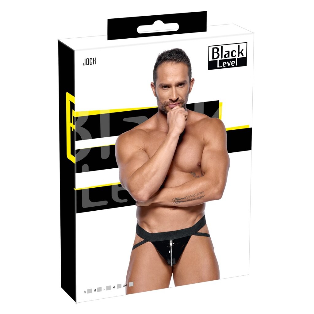 Jock en laque noire de Black Level avec une large ceinture élastique tissée confortable et des bretelles élastiques tissées confortables. Dans une poche en laque avec une fermeture éclair de couleur argentée.