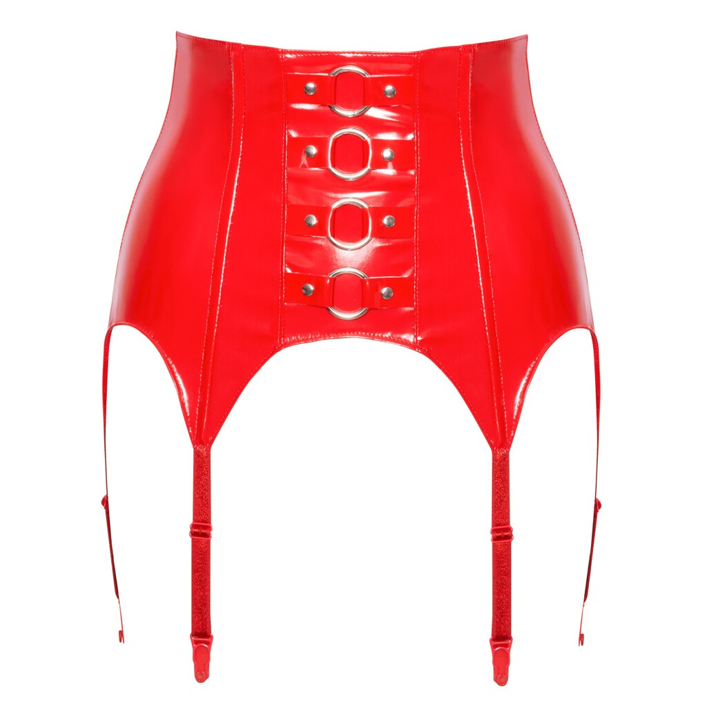 Extra breiter Strapsgürtel von Black Level komplett in glänzendem roten Lack. Mit 4 dekorativen silberfarbenen Ringen an der Vorderseite. Integrierte Formstäbchen und der verstellbare Hakenverschluss hinten sorgen für einen perfekten Sitz. Die 6 Strumpfhalterbänder (3 pro Seite) sind in der Länge verstellbar.
