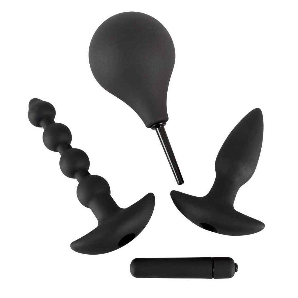 Das schwarze Set für alle Sex-Fälle! Inhalt: Plug, Kugelstrang, Intim-Dusche und Vibrator, der in Plug und Strang eingelegt werden kann. Plug ca. 15 cm lang, Ø 2,1-3,5 cm, Strang ca. 18 cm lang, Ø 1,2-3 cm, Intimdusche ca. 17 cm lang, Einführröhre der Dusche ca. 5,5 cm lang, Ø 6-9 mm. Material: Silikon, ABS, PVC. (Batterie bitte extra bestellen: 1 x Micro/AAA)