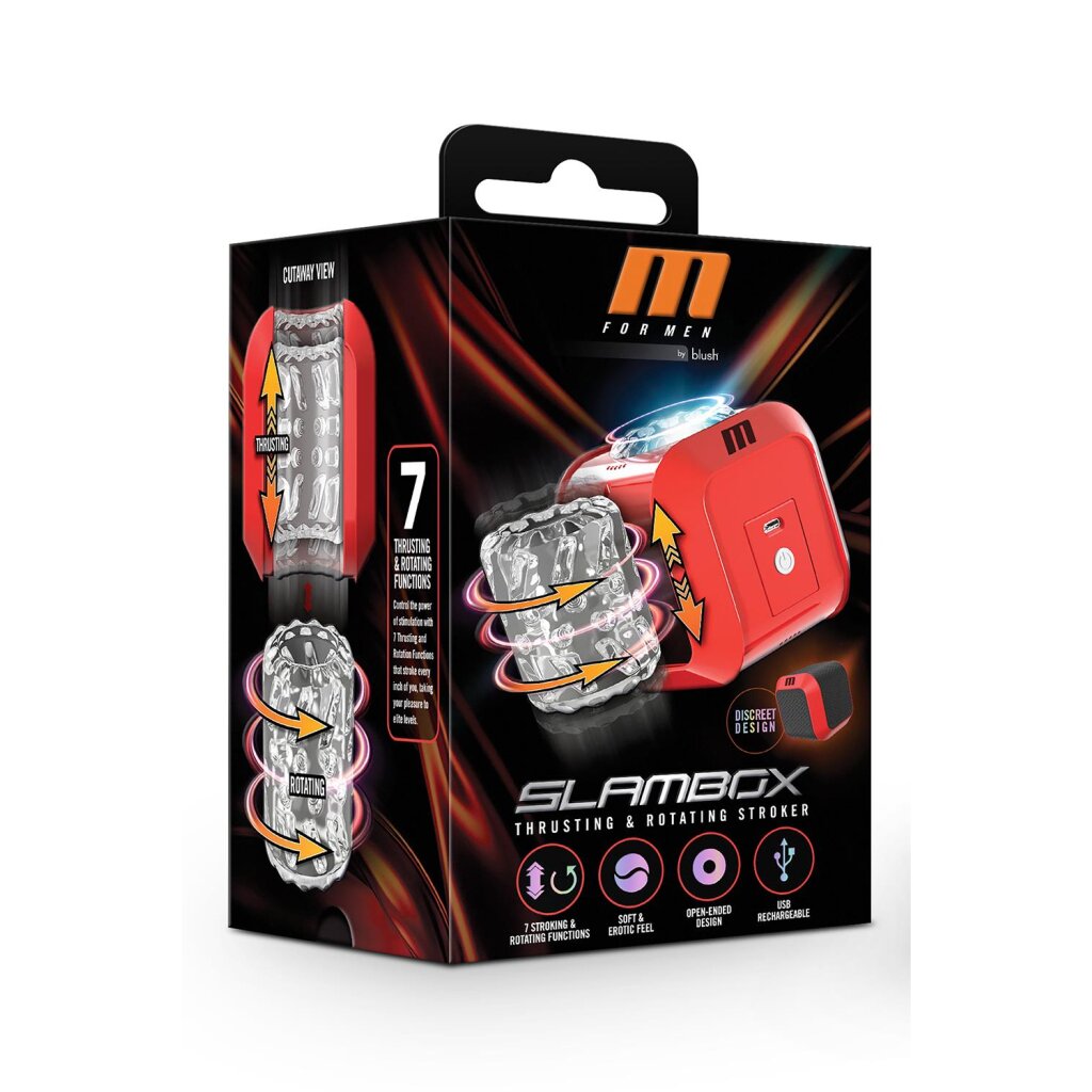 Unleash your desires with the M For Men Slambox! This powerhouse automatic male masturbator is engineered for users who demand more out of their stroker. All packed in a discreet and sleek red box, this stroker is primed to deliver a wild ride of thrills. It’s equipped with 7 modes of intense rotational stroking power that envelops you in a vortex of incredibly pleasing sensations. Amp up your experience with each click of a button, while 360° rotational stroking stimulates every inch of you, building up towards a stronger and harder release. The Slambox showcases an open-ended design that fits all sizes, accommodating all widths and lengths with its spacious inner chamber. Slide right in to enjoy the divine touch of the soft and textured interior that feels heavenly smooth and realistic when inside. With seamless USB charging, enjoy 60 minutes of run time on a single charge, so the fun never stops. Effortlessly power up and go as many rounds as you can handle with this pleasure box.