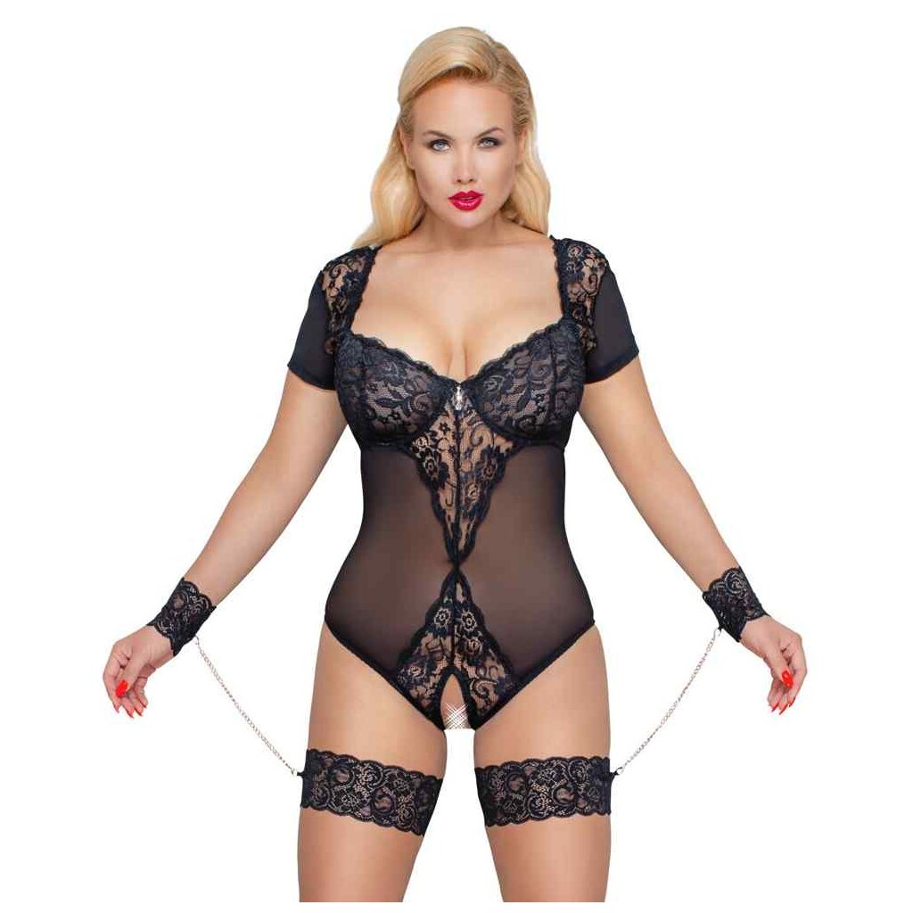 Body ouvert by Cottelli BONDAGE made of elastic powernet with fine lace inserts. With half arm and rhinestone decoration between the underwire cups. In the back with hook closure. Panty part open in the crotch, front with lace, back completely made of powernet. Included are thigh and hand cuffs made of lace, connected by rose gold-colored, detachable carabiner chains.
